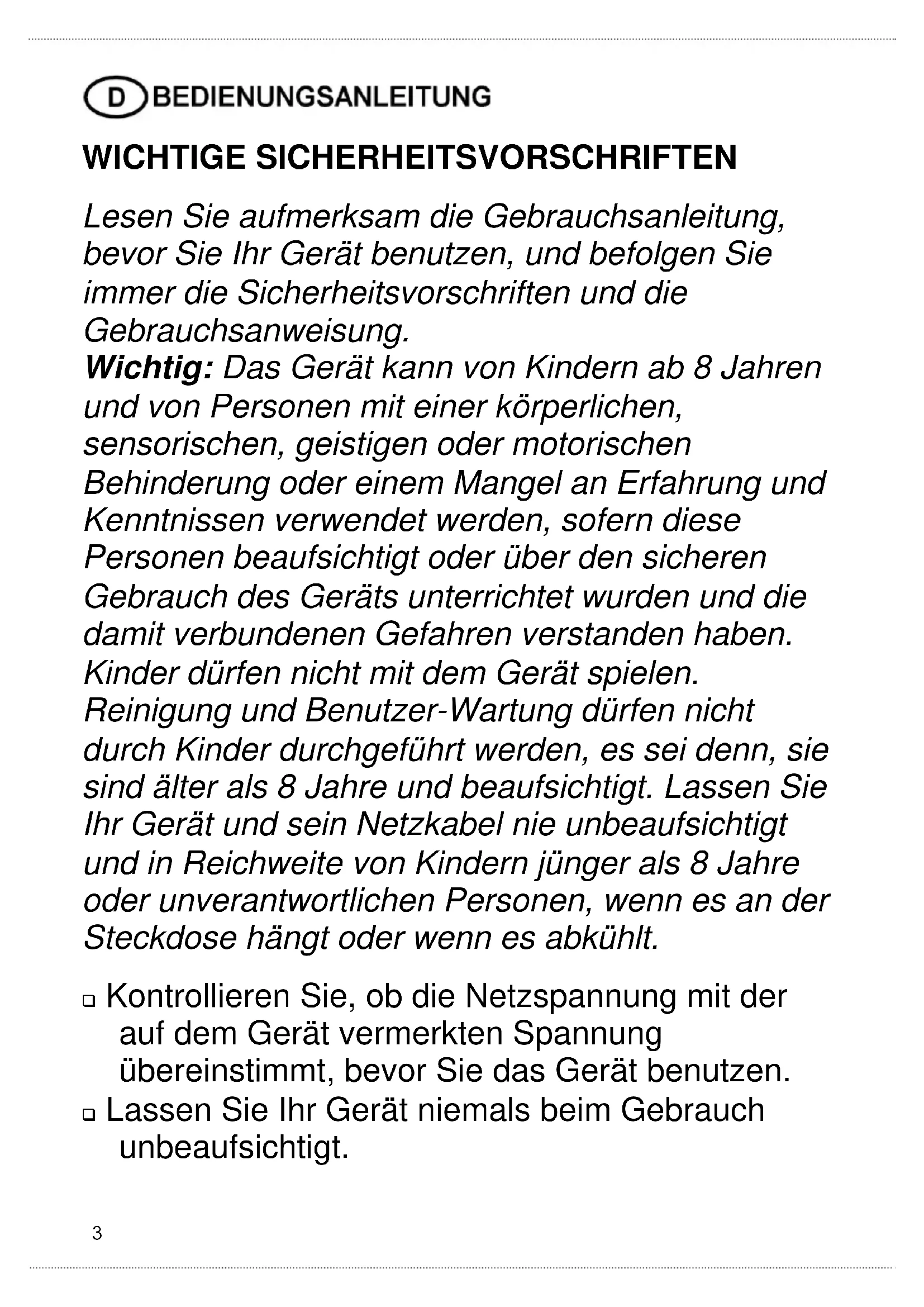WICHTIGE SICHERHEITSVORSCHRIFTEN Lesen Sie aufmerksam die Gebrauchsanleitung, bevor Sie Ihr Gerät benutzen, und befolgen Sie immer die Sicherheitsvorschriften und die Gebrauchsanweisung. Wichtig: Das Gerät kann von Kindern ab 8 Jahren und von Personen mit einer körperlichen, sensorischen, geistigen oder motorischen Behinderung oder einem Mangel an Erfahrung und Kenntnissen verwendet werden, sofern diese Personen beaufsichtigt oder über den sicheren Gebrauch des Geräts unterrichtet wurden und die damit verbundenen Gefahren verstanden haben. Kinder dürfen nicht mit dem Gerät spielen. Reinigung und Benutzer-Wartung dürfen nicht durch Kinder durchgeführt werden, es sei denn, sie sind älter als 8 Jahre und beaufsichtigt. Lassen Sie Ihr Gerät und sein Netzkabel nie unbeaufsichtigt und in Reichweite von Kindern jünger als 8 Jahre oder unverantwortlichen Personen, wenn es an der Steckdose hängt oder wenn es abkühlt. Kontrollieren Sie, ob die Netzspannung mit der auf dem Gerät vermerkten Spannung übereinstimmt, bevor Sie das Gerät benutzen. Lassen Sie Ihr Gerät niemals beim Gebrauch unbeaufsichtigt.4
