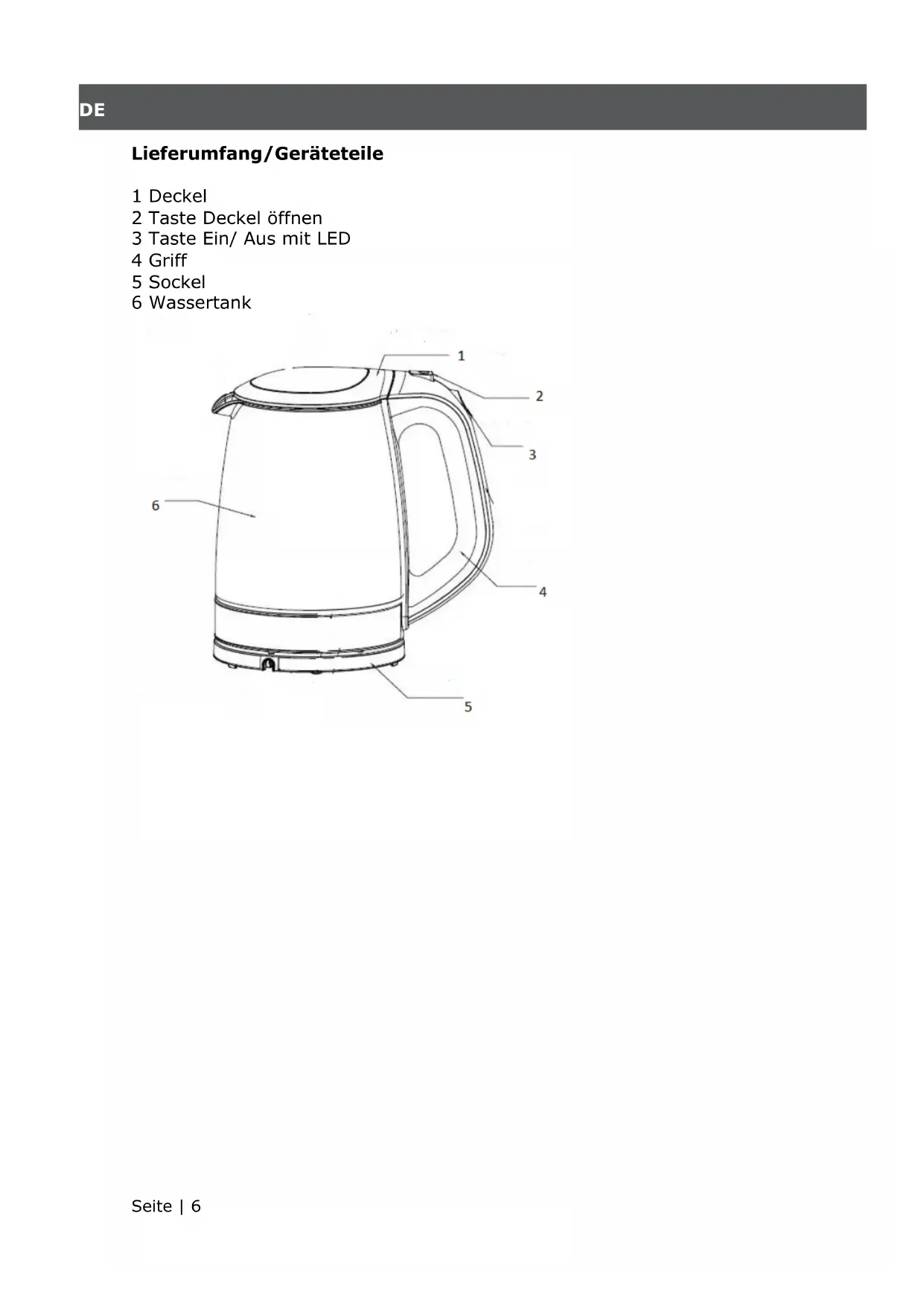 - Dieses Gerät kann von Kindern über acht Jahre und älter und von Personen mit physischen, sensorischen oder mentalen Einschränkungen oder denen die Erfahrung sowie das Wissen fehlt verwendet werden, wenn sie ordnungsgemäß beaufsichtigt werden oder wenn sie Anweisungen bezüglich der sicheren Verwendung des Geräts erhalten haben und sie die entsprechenden Gefahren verstehen. Kinder sollten nicht mit dem Gerät spielen. Die Reinigung und die Wartung sollten nicht von Kindern durchgeführt werden, es sei denn, sie sind älter als 8 Jahre und werden beaufsichtigt. 2 Verwendungszweck Das Gerät ist ausschließlich zum Erhitzen von Wasser konzipiert. Der Wasserkocher ist ausschließlich für den Privatgebrauch bestimmt und nicht für den gewerblichen Bereich geeignet. Verwenden Sie den Wasserkocher nur wie in dieser Bedienungsanleitung beschrieben. Jede andere Verwendung gilt als nicht bestimmungsgemäß und kann zu Sachschäden oder sogar zu Personenschäden führen.Seite | 9