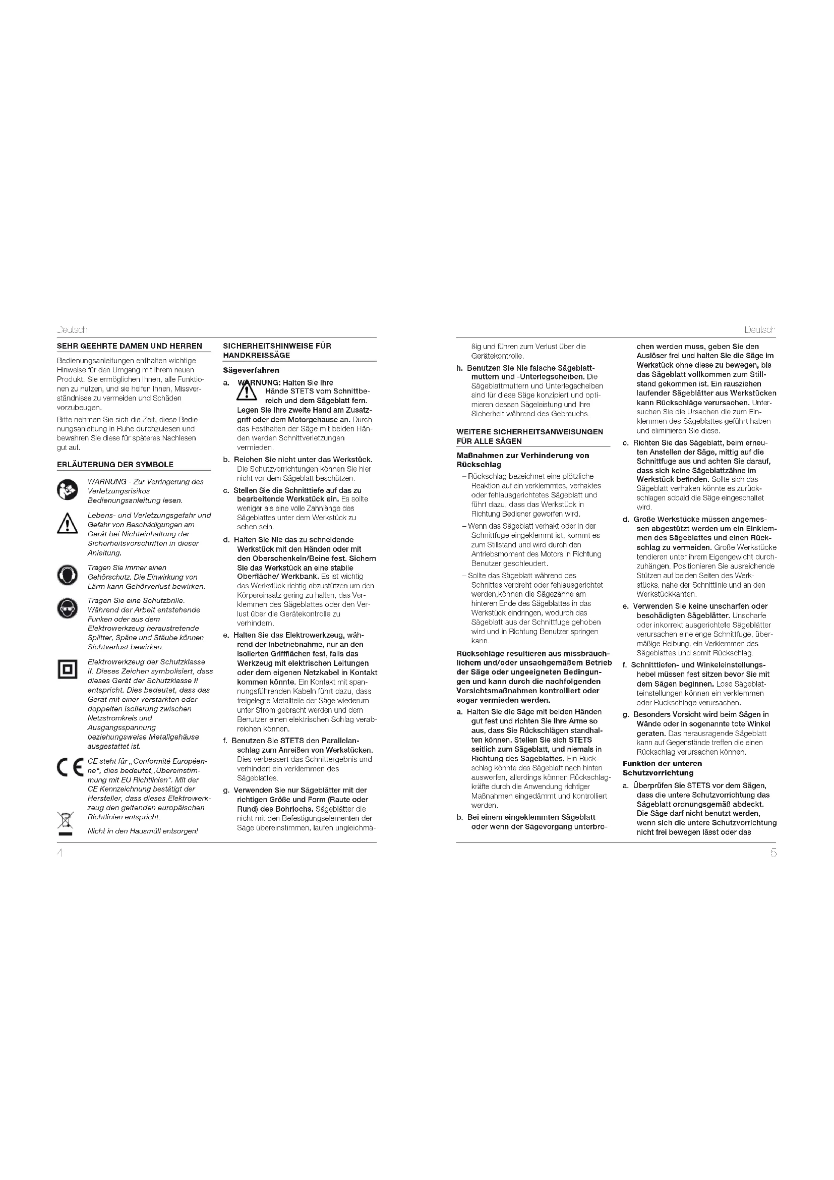 Maßnahmen zur Verhinderung von Rückschlag – Rückschlag bezeichnet eine plötzliche Reaktion auf ein verklemmtes, verhaktes oder fehlausgerichtetes Sägeblatt und führt dazu, dass das Werkstück in Richtung Bediener geworfen wird. – Wenn das Sägeblatt verhakt oder in der Schnittfuge eingeklemmt ist, kommt es zum Stillstand und wird durch den Antriebsmoment des Motors in Richtung Benutzer geschleudert. – Sollte das Sägeblatt während des Schnittes verdreht oder fehlausgerichtet werden,können die Sägezähne am hinteren Ende des Sägeblattes in das Werkstück eindringen, wodurch das Sägeblatt aus der Schnittfuge gehoben wird und in Richtung Benutzer springen kann. Rückschläge resultieren aus missbräuch- lichem und/oder unsachgemäßem Betrieb der Säge oder ungeeigneten Bedingun- gen und kann durch die nachfolgenden Vorsichtsmaßnahmen kontrolliert oder sogar vermieden werden. a. Halten Sie die Säge mit beiden Händen gut fest und richten Sie Ihre Arme so aus, dass Sie Rückschlägen standhal- ten können. Stellen Sie sich STETS seitlich zum Sägeblatt, und niemals in Richtung des Sägeblattes. Ein Rück- schlag könnte das Sägeblatt nach hinten auswerfen, allerdings können Rückschlag- kräfte durch die Anwendung richtiger Maßnahmen eingedämmt und kontrolliert werden. b. Bei einem eingeklemmten Sägeblatt oder wenn der Sägevorgang unterbro- chen werden muss, geben Sie den Auslöser frei und halten Sie die Säge im Werkstück ohne diese zu bewegen, bis das Sägeblatt vollkommen zum Still- stand gekommen ist. Ein rausziehen laufender Sägeblätter aus Werkstücken kann Rückschläge verursachen. Unter- suchen Sie die Ursachen die zum Ein- klemmen des Sägeblattes geführt haben und eliminieren Sie diese. c. Richten Sie das Sägeblatt, beim erneu- ten Anstellen der Säge, mittig auf die Schnittfuge aus und achten Sie darauf, dass sich keine Sägeblattzähne im Werkstück benden. Sollte sich das Sägeblatt verhaken könnte es zurück- schlagen sobald die Säge eingeschaltet wird. d. Große Werkstücke müssen angemes- sen abgestützt werden um ein Einklem- men des Sägeblattes und einen Rück- schlag zu vermeiden. Große Werkstücke tendieren unter ihrem Eigengewicht durch- zuhängen. Positionieren Sie ausreichende Stützen auf beiden Seiten des Werk- stücks, nahe der Schnittlinie und an den Werkstückkanten. e. Verwenden Sie keine unscharfen oder beschädigten Sägeblätter. Unscharfe oder inkorrekt ausgerichtete Sägeblätter verursachen eine enge Schnittfuge, über- mäßige Reibung, ein Verklemmen des Sägeblattes und somit Rückschlag. f. Schnitttiefen- und Winkeleinstellungs- hebel müssen fest sitzen bevor Sie mit dem Sägen beginnen. Lose Sägeblat- teinstellungen können ein verklemmen oder Rückschläge verursachen. g. Besonders Vorsicht wird beim Sägen in Wände oder in sogenannte tote Winkel geraten. Das herausragende Sägeblatt kann auf Gegenstände treffen die einen Rückschlag verursachen können. Funktion der unteren Schutzvorrichtung a. Überprüfen Sie STETS vor dem Sägen, dass die untere Schutzvorrichtung das Sägeblatt ordnungsgemäß abdeckt. Die Säge darf nicht benutzt werden, wenn sich die untere Schutzvorrichtung nicht frei bewegen lässt oder dasDeutsch