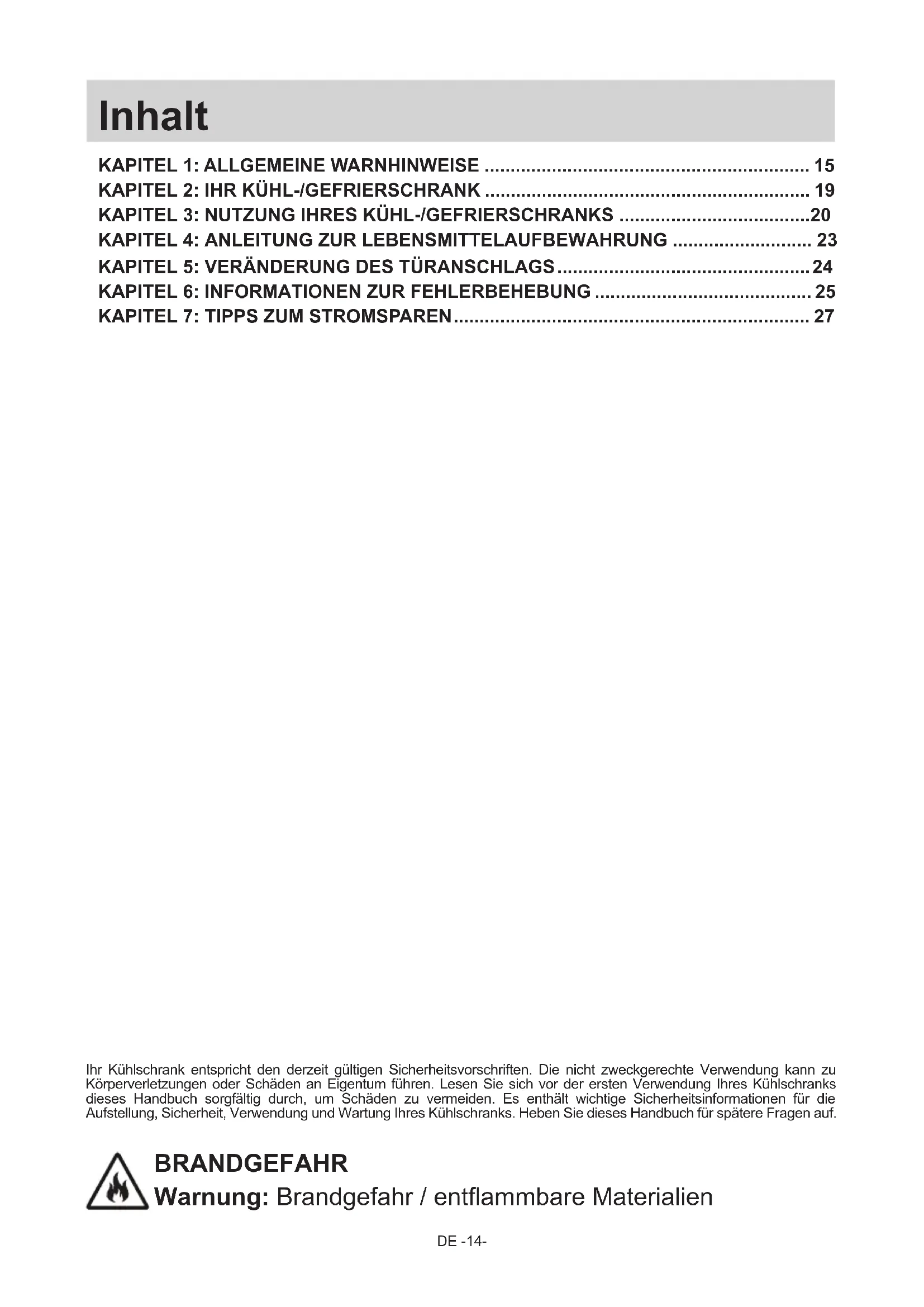 Ihr Kühlschrank entspricht den derzeit gültigen Sicherheitsvorschriften. Die nicht zweckgerechte Verwendung kann zu Körperverletzungen oder Schäden an Eigentum führen. Lesen Sie sich vor der ersten Verwendung Ihres Kühlschranks dieses Handbuch sorgfältig durch, um Schäden zu vermeiden. Es enthält wichtige Sicherheitsinformationen für die Aufstellung, Sicherheit, Verwendung und Wartung Ihres Kühlschranks. Heben Sie dieses Handbuch für spätere Fragen auf. BRANDGEFAHR Warnung: Brandgefahr / entammbare MaterialienDE -15-