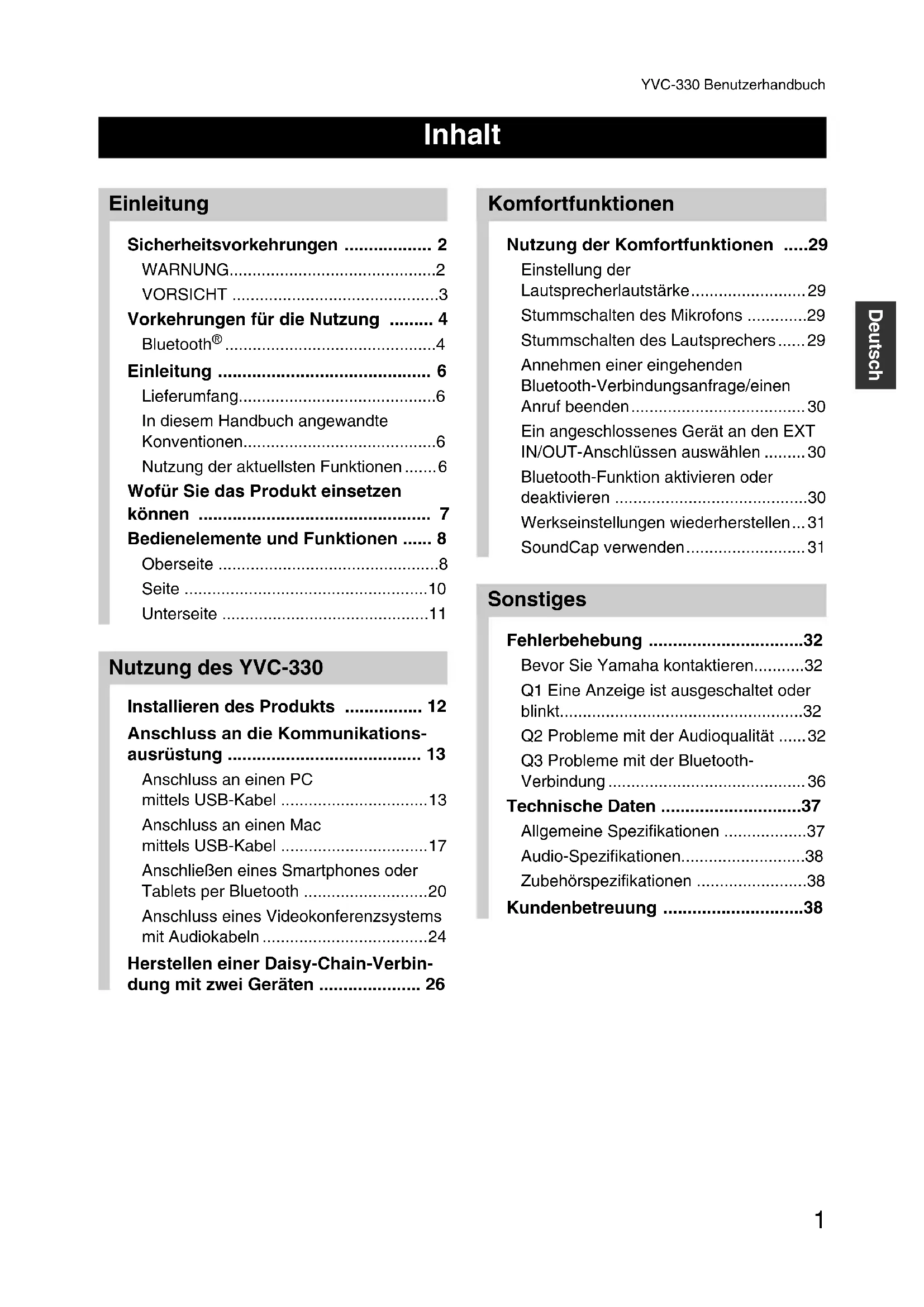 onf erenzraum verwenden. Wenn Sie SoundCap aktiviert haben, installieren Sie dieses Produkt innerhalb von 1 m von allen Teilnehmern. (→Seite 12) ■ Einstellungen von SoundCap überprüfen Wenn das Mikrofon nicht stummgeschaltet ist und die Mikrofon-Anzeige blau leuchtet, ist SoundCap aktiviert; wenn sie grün leuchtet, ist SoundCap deaktiviert. ■ SoundCap aktivieren oder deaktivieren Drücken Sie gleichzeitig die Mikrofon- Stummschaltungstaste ( ) und die Lautstärketaste ( ). Ein Benachrichtigungston erklingt und SoundCap ist aktiviert oder deaktiviert. Werkseinstellungen wiederherstellen SoundCap verwenden Hinweis32 YVC-330 Benutzerhandbuch Lesen Sie dieses Handbuch, um zu überprüfen, ob das Problem behoben werden kann. Wenn das Problem weiterhin besteht, wenden Sie sich bitte an den Händler, bei dem Sie das Produkt erworben haben. Fehlerbehebung Bevor Sie Yamaha kontaktieren Q1 Eine Anzeige ist ausgeschaltet oder blinkt Symptom Ursache Maßnahme Das Produkt scheint ausgeschaltet zu sein. Das USB-Kabel ist getrennt (und alle Anzeigen sind ausgeschaltet). Vergewissern Sie sich, dass das USB-Kabel ordnungsgemäß mit dem PC oder Mac verbunden ist. (→Seite 13, Seite 17) Sie können den Gesprächspartner nicht hören. Das Produkt ist noch nicht betriebsbereit (wenn sich die LEDs auf der Lautstärkepegel-Anzeige vor und zurück bewegen). Warten Sie, bis das Produkt gestartet wurde. (→Seite 9) Das Produkt ist im Konfigurationsmodus (wenn die Mikrofon-Anzeige weiß blinkt). Beenden Sie den Konfigurationsmodus. (→Seite 30) Es ist ein Fehler aufgetreten (wenn die Mikrofon-Anzeige schnell rot blinkt). Zwei übergeordnete Geräte sind mit einer Daisy-Chain-Verbindung verbunden (wenn nur die linke Lautstärkeanzeige grün leuchtet). Wählen Sie, welches Gerät als übergeordnetes Gerät fungiert. (→Seite 27) Ein Firmware-Update ist fehlgeschlagen (falls ausschließlich die zweite Lautstärkepegel-Anzeige [von links] grün leuchtet). Versuchen Sie erneut, das Firmware-Update durchzuführen. Es ist ein Software- oder Hardware-Fehler aufgetreten (falls die Lautstärkepegel- Anzeige in einem anderen Muster grün aufleuchtet). Lassen Sie das Produkt reparieren. Q2 Probleme mit der Audioqualität Symptom Ursache Maßnahme Sie können den Gesprächspartner nicht hören. Der Lautsprecher ist stumm geschaltet. Heben Sie die Stummschaltung des Lautsprechers auf. (→Seite 29) Die Lautstärke des Lautsprechers ist auf das Minimum eingestellt. Erhöhen Sie die Lautstärke. (→Seite 29) Auf dem per USB angeschlossenen PC oder Mac ist ein anderer Lautsprecher als YVC-330 für die Telefonieanwendung ausgewählt. Wählen Sie „YVC-330“ in den Lautsprecher- Geräteeinstellungen der Telefonieanwendung.33 YVC-330 Benutzerhandbuch Deutsch Sie können den Gesprächspartner nicht hören. Das Mikrofon des Gesprächspartners ist stumm geschaltet. Bitten Sie den Gesprächspartner, die Stummschaltung seines Mikrofons aufzuheben. Die Mikrofonempfindlichkeit des Gesprächspartners ist auf das Minimum eingestellt. Bitten Sie den Gesprächspartner, die Mikrofonempfindlichkeit zu erhöhen. Der Gesprächspartner kann Sie nicht hören. Ihr Mikrofon ist stumm geschaltet. Heben Sie die Stummschaltung Ihres Mikrofons auf. (→Seite 29) Die Mikrofonempfindlichkeit des per USB angeschlossenen PCs oder Macs ist auf das Minimum eingestellt. Erhöhen Sie die Mikrofonempfindlichkeit auf diesem Rechner. (→Seite 16, Seite 19) Auf dem per USB angeschlossenen PC oder Mac ist ein anderes Mikrofon als YVC-330 für die Telefonieanwendung ausgewählt. Wählen Sie „YVC-330“ in den Mikrofon-Geräteeinstellungen der Telefonieanwendung. Das Lautsprecher des Gesprächspartners ist stumm geschaltet. Bitten Sie den Gesprächspartner, die Stummschaltung seines Lautsprechers aufzuheben. Die Lautsprecher-Lautstärke des Gesprächspartners ist auf das Minimum eingestellt. Bitten Sie den Gesprächspartner, die Lautstärke seines Lautsprechers zu erhöhen. Der Gesprächspartner kann keine Töne hören, die weit von diesem Produkt entfernt sind. SoundCap ist aktiviert. Deaktivieren Sie SoundCap. (→Seite 31) Sie hören Echos. Der Gesprächspartner hat ein Problem mit seiner Gerätekonfiguration oder Betriebsumgebung.