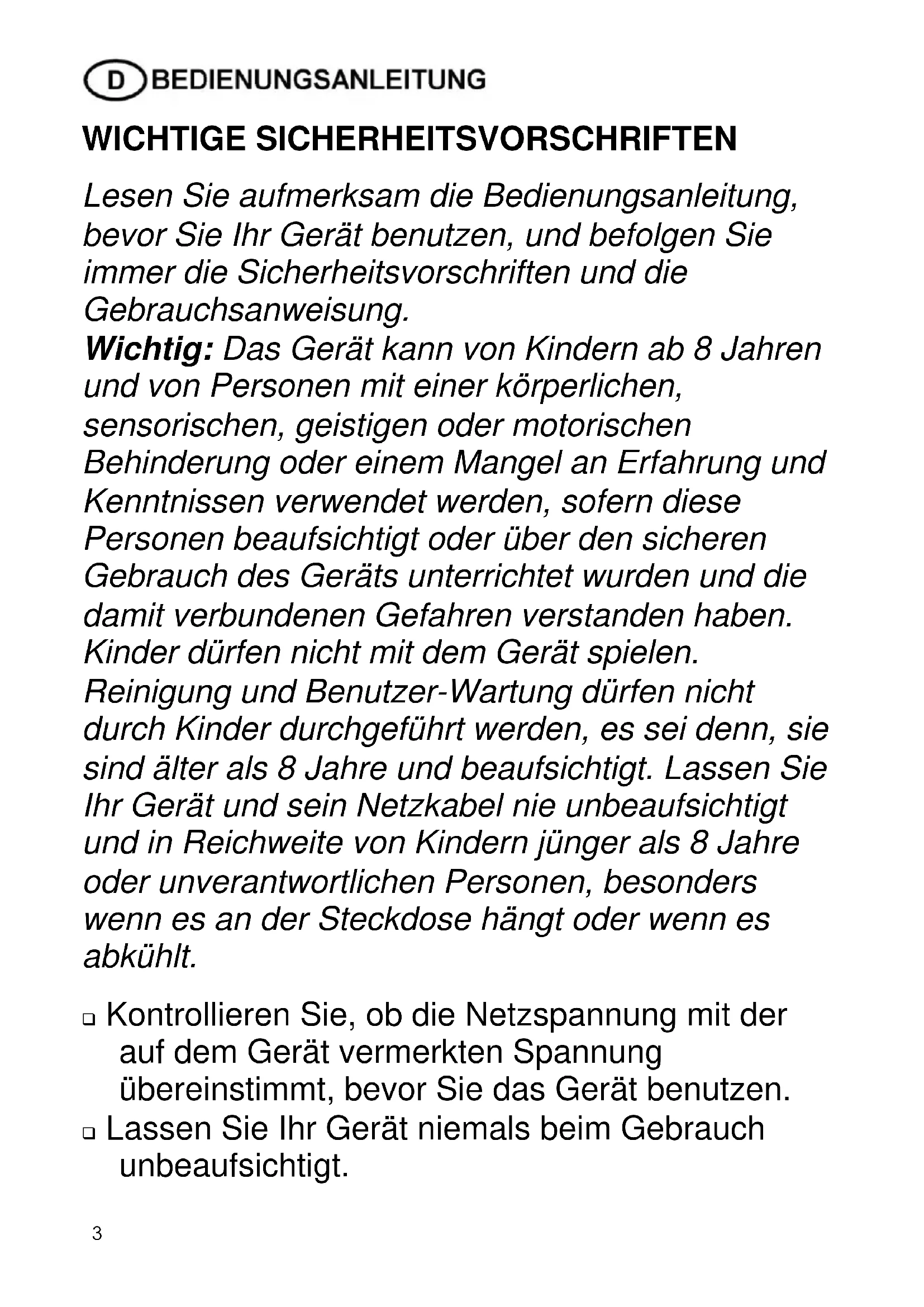WICHTIGE SICHERHEITSVORSCHRIFTEN Lesen Sie aufmerksam die Bedienungsanleitung, bevor Sie Ihr Gerät benutzen, und befolgen Sie immer die Sicherheitsvorschriften und die Gebrauchsanweisung. Wichtig: Das Gerät kann von Kindern ab 8 Jahren und von Personen mit einer körperlichen, sensorischen, geistigen oder motorischen Behinderung oder einem Mangel an Erfahrung und Kenntnissen verwendet werden, sofern diese Personen beaufsichtigt oder über den sicheren Gebrauch des Geräts unterrichtet wurden und die damit verbundenen Gefahren verstanden haben. Kinder dürfen nicht mit dem Gerät spielen. Reinigung und Benutzer-Wartung dürfen nicht durch Kinder durchgeführt werden, es sei denn, sie sind älter als 8 Jahre und beaufsichtigt. Lassen Sie Ihr Gerät und sein Netzkabel nie unbeaufsichtigt und in Reichweite von Kindern jünger als 8 Jahre oder unverantwortlichen Personen, besonders wenn es an der Steckdose hängt oder wenn es abkühlt. Kontrollieren Sie, ob die Netzspannung mit der auf dem Gerät vermerkten Spannung übereinstimmt, bevor Sie das Gerät benutzen. Lassen Sie Ihr Gerät niemals beim Gebrauch unbeaufsichtigt..
