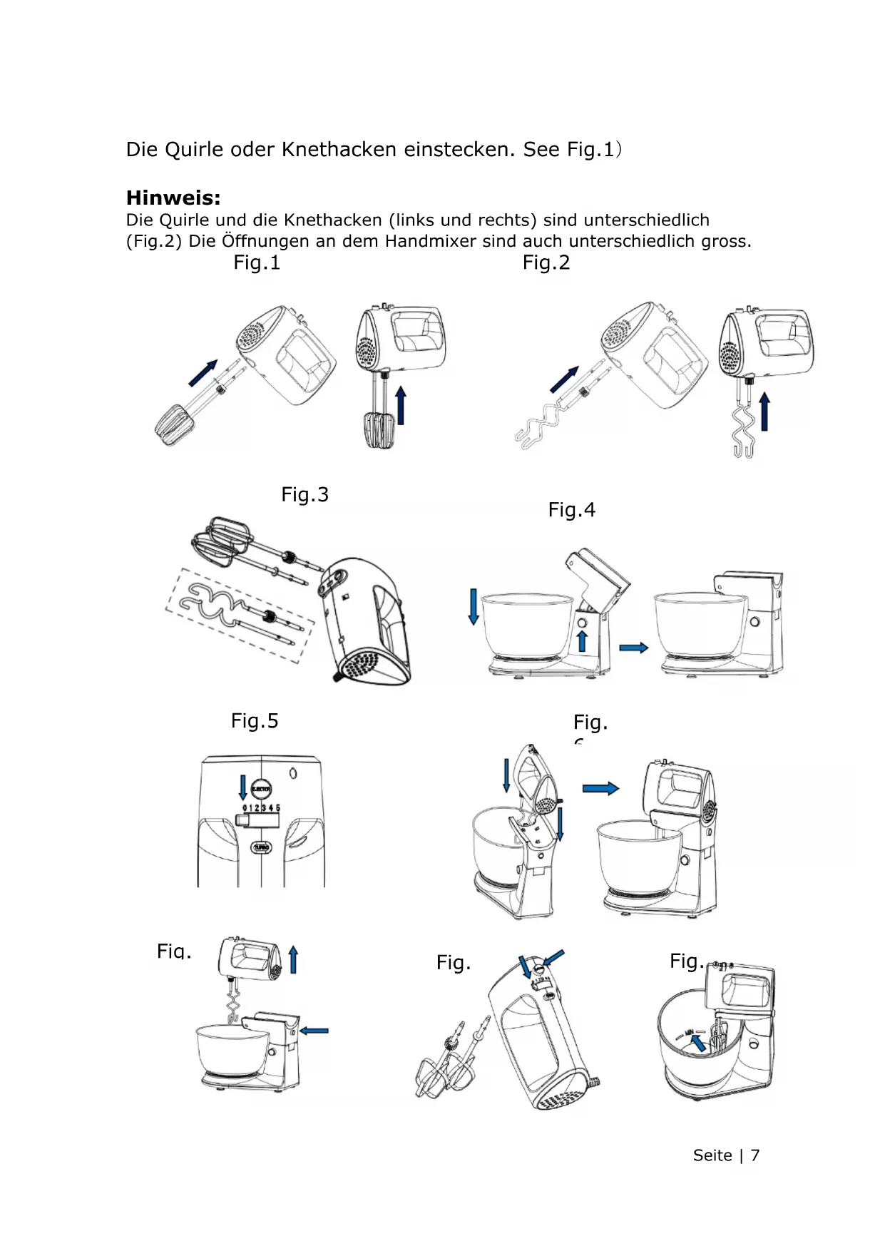 Die Quirle oder Knethacken einstecken. See Fig.1) Hinweis: Die Quirle und die Knethacken (links und rechts) sind unterschiedlich (Fig.2) Die Öffnungen an dem Handmixer sind auch unterschiedlich gross. Fig.1 Fig.2