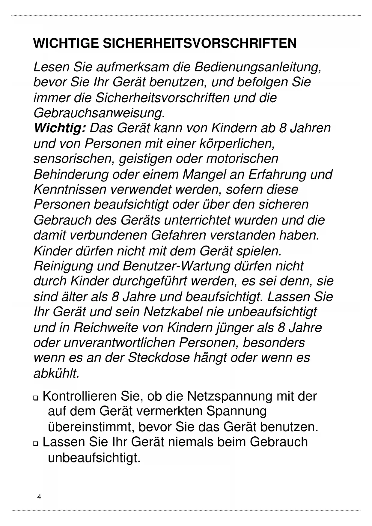 WICHTIGE SICHERHEITSVORSCHRIFTEN Lesen Sie aufmerksam die Bedienungsanleitung, bevor Sie Ihr Gerät benutzen, und befolgen Sie immer die Sicherheitsvorschriften und die Gebrauchsanweisung. Wichtig: Das Gerät kann von Kindern ab 8 Jahren und von Personen mit einer körperlichen, sensorischen, geistigen oder motorischen Behinderung oder einem Mangel an Erfahrung und Kenntnissen verwendet werden, sofern diese Personen beaufsichtigt oder über den sicheren Gebrauch des Geräts unterrichtet wurden und die damit verbundenen Gefahren verstanden haben. Kinder dürfen nicht mit dem Gerät spielen. Reinigung und Benutzer-Wartung dürfen nicht durch Kinder durchgeführt werden, es sei denn, sie sind älter als 8 Jahre und beaufsichtigt. Lassen Sie Ihr Gerät und sein Netzkabel nie unbeaufsichtigt und in Reichweite von Kindern jünger als 8 Jahre oder unverantwortlichen Personen, besonders wenn es an der Steckdose hängt oder wenn es abkühlt. Kontrollieren Sie, ob die Netzspannung mit der auf dem Gerät vermerkten Spannung übereinstimmt, bevor Sie das Gerät benutzen. Lassen Sie Ihr Gerät niemals beim Gebrauch unbeaufsichtigt.5