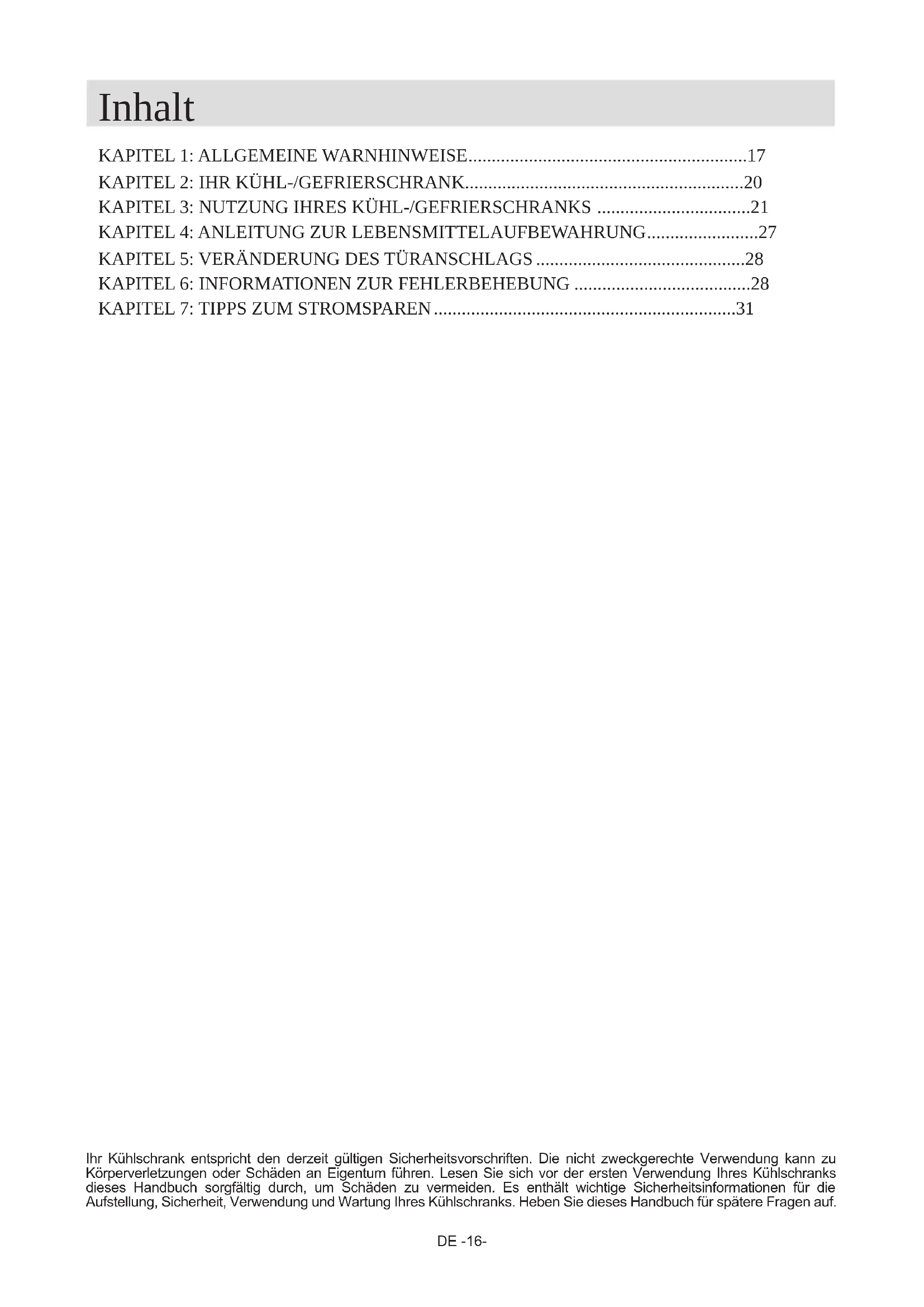 Ihr Kühlschrank entspricht den derzeit gültigen Sicherheitsvorschriften. Die nicht zweckgerechte Verwendung kann zu Körperverletzungen oder Schäden an Eigentum führen. Lesen Sie sich vor der ersten Verwendung Ihres Kühlschranks dieses Handbuch sorgfältig durch, um Schäden zu vermeiden. Es enthält wichtige Sicherheitsinformationen für die Aufstellung, Sicherheit, Verwendung und Wartung Ihres Kühlschranks. Heben Sie dieses Handbuch für spätere Fragen auf.DE -17-