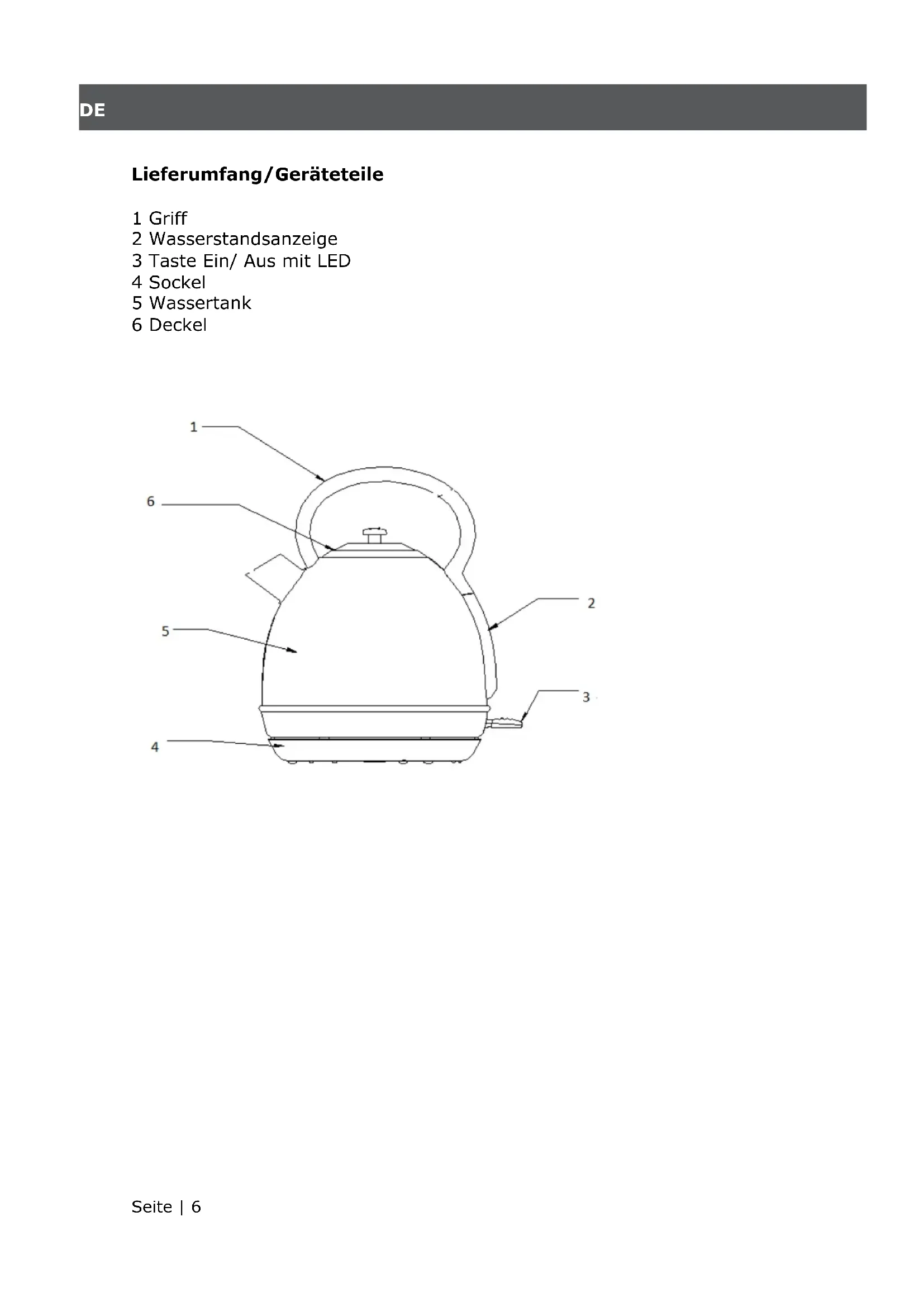 5 Reinigung, Entkalkung und Aufbewahrung WARNUNG Verbrühungs- und Verbrennungsgefahr! Der Wasserkocher wird während des Betriebs heiß und es tritt heißer Wasserdampf aus! - Lassen Sie den Wasserkocher vor jeder Reinigung vollständig abkühlen. - Halten Sie sich und andere Personen vom austretenden Wasserdampf fern! - Schließen Sie vor dem Einschalten des Wasserkochers den Deckel! - Öffnen Sie niemals den Deckel, wenn Sie heißes Wasser ausgießen! WICHTIG Beschädigungsgefahr! Der Wasserkocher kann durch unsachgemäße Reinigung beschädigt werden. - Verwenden Sie keine aggressiven Reinigungsmittel, Bürsten mit Metall- oder Nylonborsten, sowie scharfe oder metallische Reinigungsgegenstände wie Messer, harte Spachtel und dergleichen. Diese können die Oberflächen beschädigen. - Geben Sie den Wasserbehälter oder den Sockel keinesfalls in die Spülmaschine. Sie würden den Wasserkocher dadurch zerstören. - Tauchen Sie den Wasserkocher zum Reinigen niemals in Wasser und verwenden Sie zur Reinigung keinen Dampfreiniger. Der Wasserkocher kann sonst beschädigt werden.