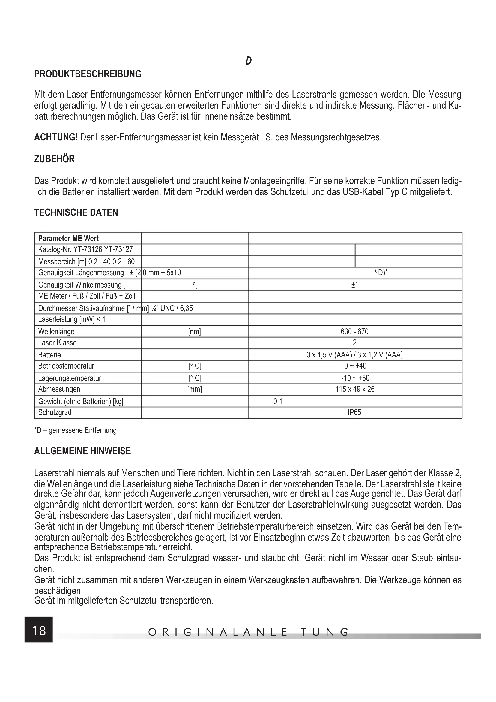 PRODUKTBESCHREIBUNG Mit dem Laser-Entfernungsmesser können Entfernungen mithilfe des Laserstrahls gemessen werden. Die Messung erfolgt geradlinig. Mit den eingebauten erweiterten Funktionen sind direkte und indirekte Messung, Flächen- und Ku- baturberechnungen möglich. Das Gerät ist für Inneneinsätze bestimmt. ACHTUNG! Der Laser-Entfernungsmesser ist kein Messgerät i.S. des Messungsrechtgesetzes. ZUBEHÖR Das Produkt wird komplett ausgeliefert und braucht keine Montageeingriffe. Für seine korrekte Funktion müssen ledig- lich die Batterien installiert werden. Mit dem Produkt werden das Schutzetui und das USB-Kabel Typ C mitgeliefert. TECHNISCHE DATEN Parameter ME Wert Katalog-Nr. YT-73126 YT-73127 Messbereich [m] 0,2 - 40 0,2 - 60 Genauigkeit Längenmessung - ± (2,0 mm + 5x10