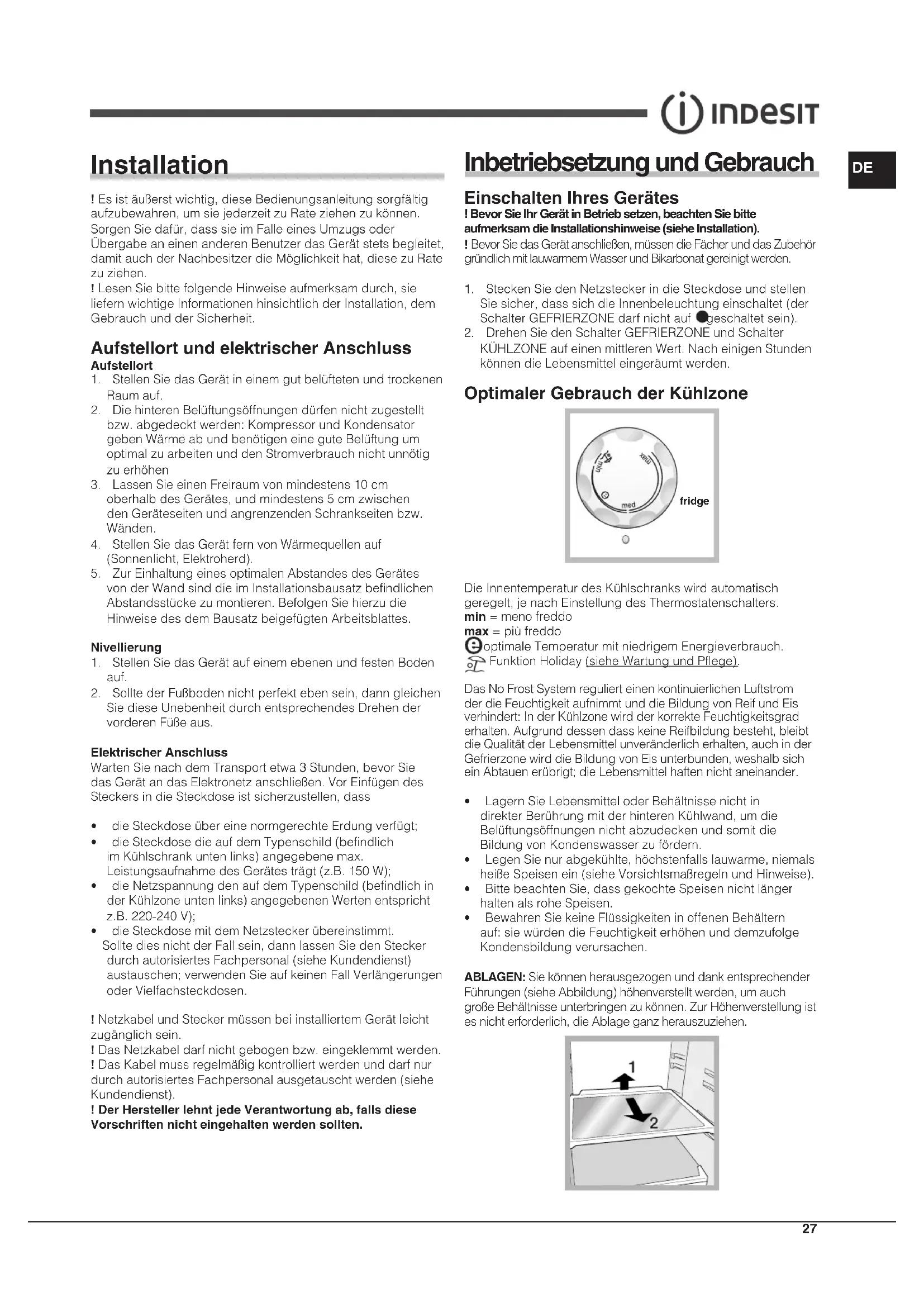 KÜHLZONEaufeinenmittlerenWert.NacheinigenStunden könnendieLebensmitteleingeräumtwerden. Optimaler Gebrauch der Kühlzone fridge DieInnentemperaturdesKühlschrankswirdautomatisch geregelt,jenachEinstellungdesThermostatenschalters. min=menofreddo max=piùfreddo optimaleTemperaturmitniedrigemEnergieverbrauch. FunktionHoliday(sieheWartungundPflege). DasNoFrostSystemregulierteinenkontinuierlichenLuftstrom derdieFeuchtigkeitaufnimmtunddieBildungvonReifundEis verhindert:InderKühlzonewirdderkorrekteFeuchtigkeitsgrad erhalten.AufgrunddessendasskeineReifbildungbesteht,bleibt dieQualitätderLebensmittelunveränderlicherhalten,auchinder GefrierzonewirddieBildungvonEisunterbunden,weshalbsich einAbtauenerübrigt;dieLebensmittelhaftennichtaneinander.