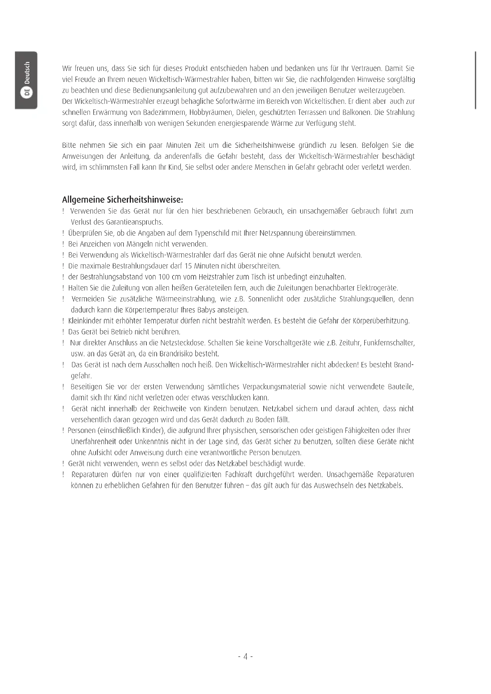 - Záruka Inhaltsverzeichnis Contents Índice Indice Table des matières Inhoudsopgave Indhold Πίνακας περιεχομένων Spis treści Obsah- 4 - Wir freuen uns, dass Sie sich für dieses Produkt entschieden haben und bedanken uns für Ihr Vertrauen. Damit Sie viel Freude an Ihrem neuen Wickeltisch-Wärmestrahler haben, bitten wir Sie, die nachfolgenden Hinweise sorgfältig zu beachten und diese Bedienungsanleitung gut aufzubewahren und an den jeweiligen Benutzer weiterzugeben. Der Wickeltisch-Wärmestrahler erzeugt behagliche Sofortwärme im Bereich von Wickeltischen. Er dient aber auch zur schnellen Erwärmung von Badezimmern, Hobbyräumen, Dielen, geschützten Terrassen und Balkonen. Die Strahlung sorgt dafür, dass innerhalb von wenigen Sekunden energiesparende Wärme zur Verfügung steht. Bitte nehmen Sie sich ein paar Minuten Zeit um die Sicherheitshinweise gründlich zu lesen. Befolgen Sie die Anweisungen der Anleitung, da anderenfalls die Gefahr besteht, dass der Wickeltisch-Wärmestrahler beschädigt wird, im schlimmsten Fall kann Ihr Kind, Sie selbst oder andere Menschen in Gefahr gebracht oder verletzt werden. Allgemeine Sicherheitshinweise: ! Verwenden Sie das Gerät nur für den hier beschriebenen Gebrauch, ein unsachgemäßer Gebrauch führt zum Verlust des Garantieanspruchs. ! Überprüfen Sie, ob die Angaben auf dem Typenschild mit Ihrer Netzspannung übereinstimmen. ! Bei Anzeichen von Mängeln nicht verwenden. ! Bei Verwendung als Wickeltisch-Wärmestrahler darf das Gerät nie ohne Aufsicht benutzt werden. ! Die maximale Bestrahlungsdauer darf 15 Minuten nicht überschreiten. ! der Bestrahlungsabstand von 100 cm vom Heizstrahler zum Tisch ist unbedingt einzuhalten. ! Halten Sie die Zuleitung von allen heißen Geräteteilen fern, auch die Zuleitungen benachbarter Elektrogeräte. ! Vermeiden Sie zusätzliche Wärmeeinstrahlung, wie z.B. Sonnenlicht oder zusätzliche Strahlungsquellen, denn dadurch kann die Körpertemperatur Ihres Babys ansteigen. ! Kleinkinder mit erhöhter Temperatur dürfen nicht bestrahlt werden. Es besteht die Gefahr der Körperüberhitzung. ! Das Gerät bei Betrieb nicht berühren. ! Nur direkter Anschluss an die Netzsteckdose. Schalten Sie keine Vorschaltgeräte wie z.B. Zeituhr, Funkfernschalter, usw. an das Gerät an, da ein Brandrisiko besteht. ! Das Gerät ist nach dem Ausschalten noch heiß. Den Wickeltisch-Wärmestrahler nicht abdecken! Es besteht Brand- gefahr. ! Beseitigen Sie vor der ersten Verwendung sämtliches Verpackungsmaterial sowie nicht verwendete Bauteile, damit sich Ihr Kind nicht verletzen oder etwas verschlucken kann. ! Gerät nicht innerhalb der Reichweite von Kindern benutzen. Netzkabel sichern und darauf achten, dass nicht versehentlich daran gezogen wird und das Gerät dadurch zu Boden fällt. ! Personen (einschließlich Kinder), die aufgrund Ihrer physischen, sensorischen oder geistigen Fähigkeiten oder Ihrer Unerfahrenheit oder Unkenntnis nicht in der Lage sind, das Gerät sicher zu benutzen, sollten diese Geräte nicht ohne Aufsicht oder Anweisung durch eine verantwortliche Person benutzen. ! Gerät nicht verwenden, wenn es selbst oder das Netzkabel beschädigt wurde. ! Reparaturen dürfen nur von einer qualifizierten Fachkraft durchgeführt werden. Unsachgemäße Reparaturen können zu erheblichen Gefahren für den Benutzer führen – das gilt auch für das Auswechseln des Netzkabels. p. 52