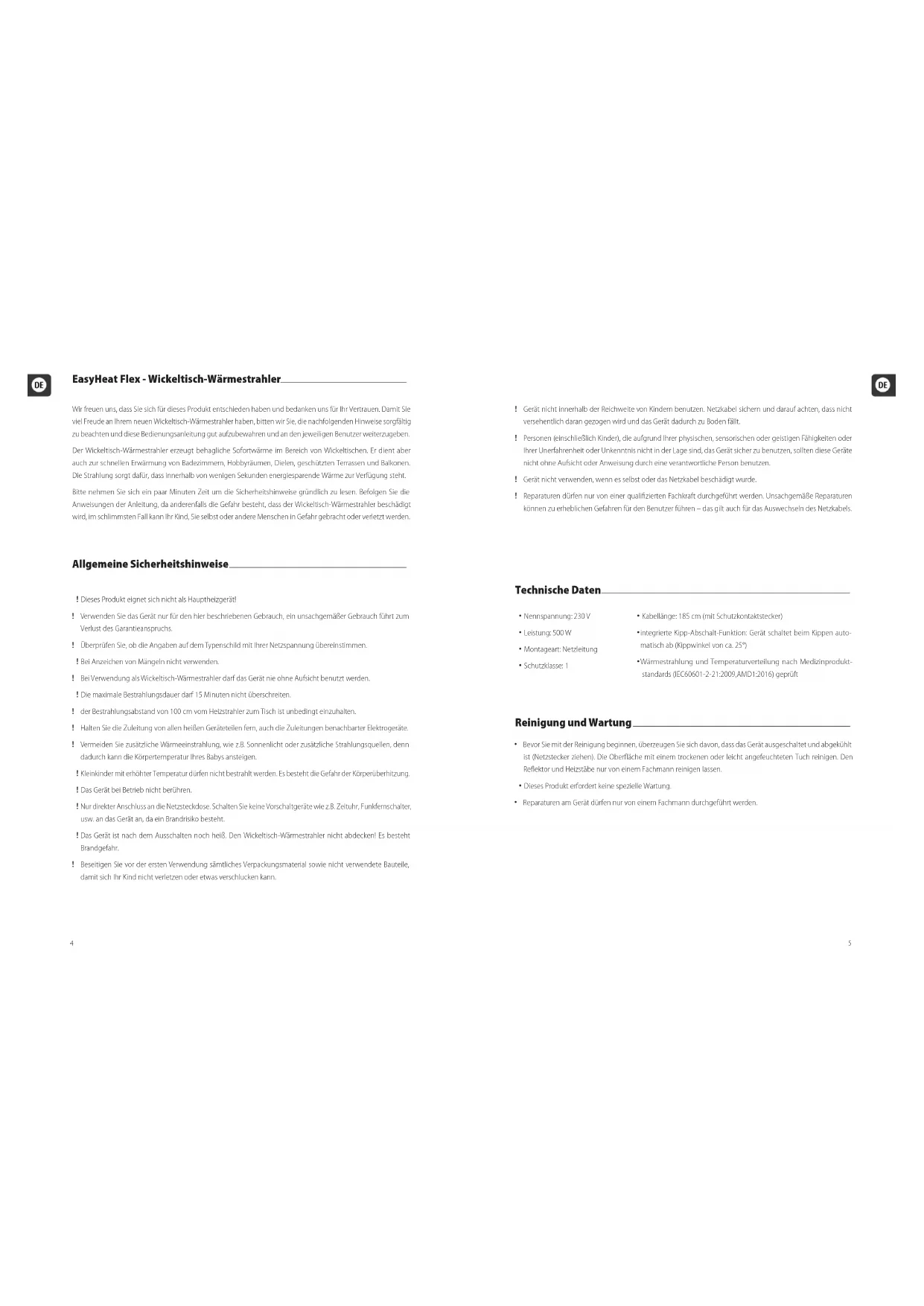 Wärmestrahlung und Temperaturverteilung nach Medizinprodukt- standards (IEC60601-2-21:2009,AMD1:2016) geprüft ! Gerät nicht innerhalb der Reichweite von Kindern benutzen. Netzkabel sichern und darauf achten, dass nicht versehentlich daran gezogen wird und das Gerät dadurch zu Boden fällt. ! Personen (einschließlich Kinder), die aufgrund Ihrer physischen, sensorischen oder geistigen Fähigkeiten oder Ihrer Unerfahrenheit oder Unkenntnis nicht in der Lage sind, das Gerät sicher zu benutzen, sollten diese Geräte nicht ohne Aufsicht oder Anweisung durch eine verantwortliche Person benutzen. ! Gerät nicht verwenden, wenn es selbst oder das Netzkabel beschädigt wurde. ! Reparaturen dürfen nur von einer qualifizierten Fachkraft durchgeführt werden. Unsachgemäße Reparaturen können zu erheblichen Gefahren für den Benutzer führen – das gilt auch für das Auswechseln des Netzkabels. Reinigung und Wartung