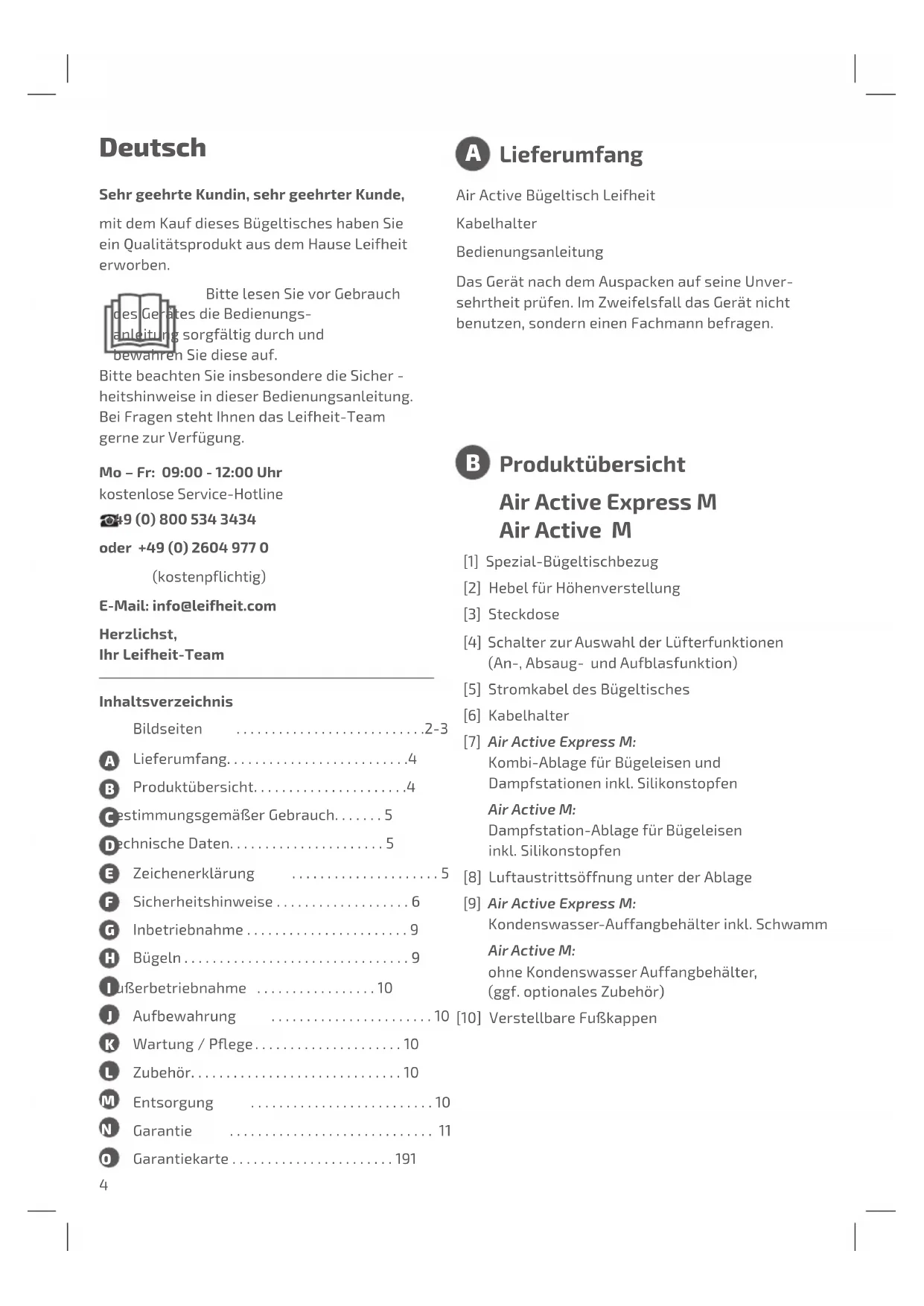 Lieferumfang Deutsch Sehr geehrte Kundin, sehr geehrter Kunde, mit dem Kauf dieses Bügeltisches haben Sie ein Qualitätsprodukt aus dem Hause Leifheit erworben. Bitte lesen Sie vor Gebrauch des Gerätes die Bedienungs- anleitung sorgfältig durch und bewahren Sie diese auf. Bitte beachten Sie insbesondere die Sicher - heitshinweise in dieser Bedienungsanleitung. Bei Fragen steht Ihnen das Leifheit-Team gerne zur Verfügung. Mo – Fr: 09:00 - 12:00 Uhr kostenlose Service-Hotline +49 (0) 800 534 3434 oder +49 (0) 2604 977 0 (kostenpflichtig) E-Mail: info@leifheit.com Herzlichst, Ihr Leifheit-Team Air Active Express M Air Active M [1] Spezial-Bügeltischbezug [2] Hebel für Höhenverstellung [3] Steckdose [4] Schalter zur Auswahl der Lüfterfunktionen (An-, Absaug- und Aufblasfunktion) [5] Stromkabel des Bügeltisches [6] Kabelhalter [7] Air Active Express M: Kombi-Ablage für Bügeleisen und Dampfstationen inkl. Silikonstopfen Air Active M: Dampfstation-Ablage für Bügeleisen inkl. Silikonstopfen [8] Luftaustrittsöffnung unter der Ablage [9] Air Active Express M: Kondenswasser-Auffangbehälter inkl. Schwamm Air Active M: ohne Kondenswasser Auffangbehälter, (ggf. optionales Zubehör) [10] Verstellbare Fußkappen Produktübersicht