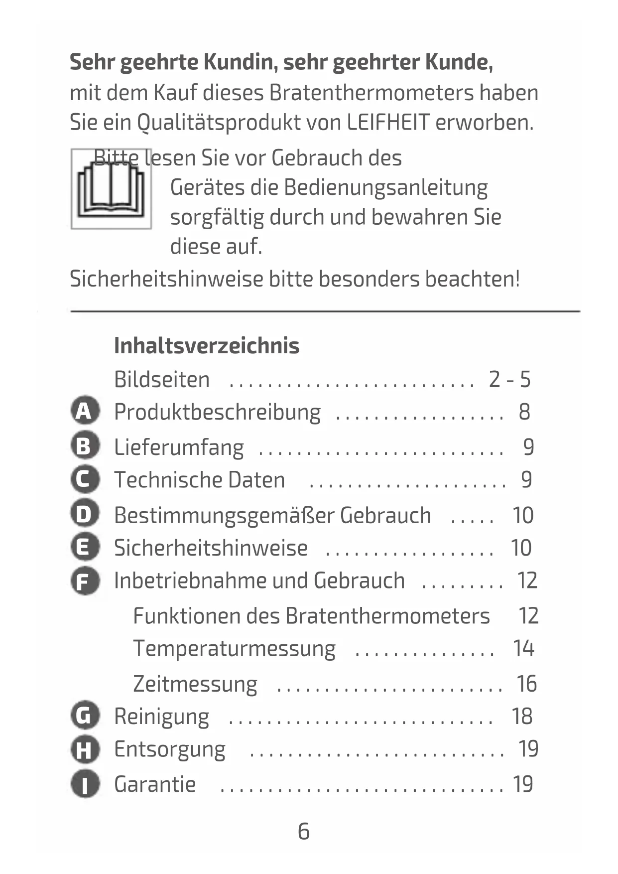 RO23456 Sehr geehrte Kundin, sehr geehrter Kunde, mit dem Kauf dieses Bratenthermometers haben Sie ein Qualitätsprodukt von LEIFHEIT erworben. Bitte lesen Sie vor Gebrauch des Gerätes die Bedienungsanleitung sorgfältig durch und bewahren Sie diese auf. Sicherheitshinweise bitte besonders beachten!