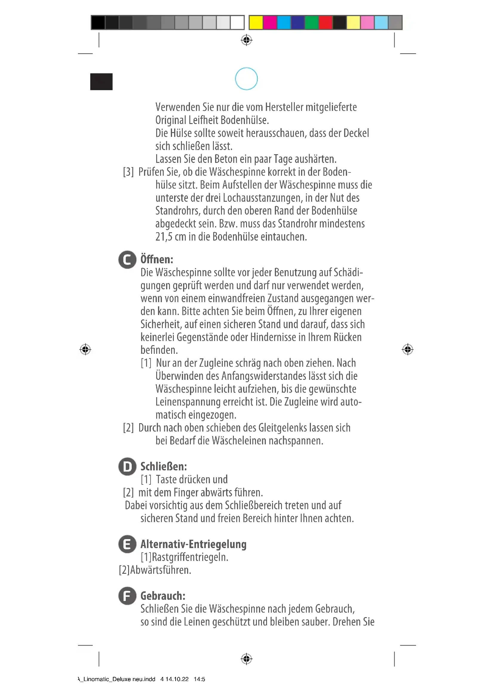 Gebrauch: Schließen Sie die Wäschespinne nach jedem Gebrauch, so sind die Leinen geschützt und bleiben sauber. Drehen Sie *BA_Linomatic_Deluxe neu.indd 4 14.10.22 14:56beim Wäscheaufhängen die Wäschespinne in der Boden- hülse, das spart Zeit und Wege. Die Wäsche nicht einseitig und nicht bei starkem Wind aufhängen.