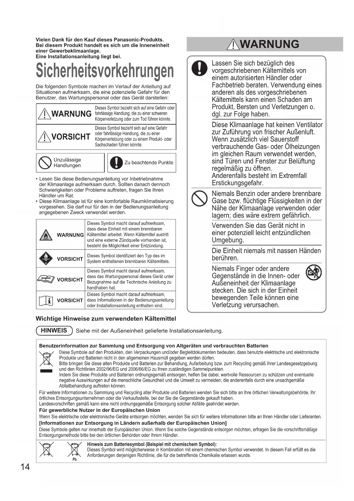 Indicador de ltroControl remoto con cableIndicador de ltroSalida de aireEntrada de aireLímpiela con un paño suave.(Si está muy sucia, utilice un paño humedecido con agua). OI_00_320954_all.indb 13 2020/9/8 16:24:3114 Vielen Dank für den Kauf dieses Panasonic-Produkts.Bei diesem Produkt handelt es sich um die Inneneinheit einer Gewerbeklimaanlage.Eine Installationsanleitung liegt bei. Sicherheitsvorkehrungen Die folgenden Symbole machen im Verlauf der Anleitung auf Situationen aufmerksam, die eine potenzielle Gefahr für den Benutzer, das Wartungspersonal oder das Gerät darstellen: WARNUNG Dieses Symbol bezieht sich auf eine Gefahr oder fahrlässige Handlung, die zu einer schweren Körperverletzung oder zum Tod führen könnte. VORSICHT Dieses Symbol bezieht sich auf eine Gefahr oder fahrlässige Handlung, die zu einer Körperverletzung oder zu einem Produkt- oder Sachschaden führen könnte.Unzulässige HandlungenZu beachtende Punkte Lesen Sie diese Bedienungsanleitung vor Inbetriebnahme der Klimaanlage aufmerksam durch. Sollten danach dennoch Schwierigkeiten oder Probleme auftreten, fragen Sie Ihren Händler um Rat. Diese Klimaanlage ist für eine komfortable Raumklimatisierung vorgesehen. Sie darf nur für den in der Bedienungsanleitung angegebenen Zweck verwendet werden. Lassen Sie sich bezüglich des vorgeschriebenen Kältemittels von einem autorisierten Händler oder Fachbetrieb beraten. Verwendung eines anderen als des vorgeschriebenen Kältemittels kann einen Schaden am Produkt, Bersten und Verletzungen o. dgl. zur Folge haben. Diese Klimaanlage hat keinen Ventilator zur Zuführung von frischer Außenluft. Wenn zusätzlich viel Sauerstoff verbrauchende Gas- oder Ölheizungen im gleichen Raum verwendet werden, sind Türen und Fenster zur Belüftung regelmäßig zu öffnen. Anderenfalls besteht im Extremfall Erstickungsgefahr. Niemals Benzin oder andere brennbare Gase bzw. üchtige Flüssigkeiten in der Nähe der Klimaanlage verwenden oder lagern; dies wäre extrem gefährlich. Verwenden Sie das Gerät nicht in einer potenziell leicht entzündlichen Umgebung. Die Einheit niemals mit nassen Händen berühren. Niemals Finger oder andere Gegenstände in die Innen- oder Außeneinheit der Klimaanlage stecken. Die sich in der Einheit bewegenden Teile können eine Verletzung verursachen. WARNUNG WARNUNGDieses Symbol macht darauf aufmerksam, dass diese Einheit mit einem brennbaren Kältemittel arbeitet. Wenn Kältemittel austritt und eine externe Zündquelle vorhanden ist, besteht die Möglichkeit einer Entzündung.VORSICHTDieses Symbol identifiziert den Typ des im System enthaltenen brennbaren Kältemittels.VORSICHTDieses Symbol macht darauf aufmerksam, dass das Wartungspersonal dieses Gerät unter Bezugnahme auf die Technische Anleitung zu handhaben hat.VORSICHTDieses Symbol macht darauf aufmerksam, dass Informationen in der Bedienungsanleitung oder Installationsanleitung enthalten sind.Wichtige Hinweise zum verwendeten KältemittelHINWEIS Siehe mit der Außeneinheit gelieferte Installationsanleitung.Benutzerinformation zur Sammlung und Entsorgung von Altgeräten und verbrauchten Batterien