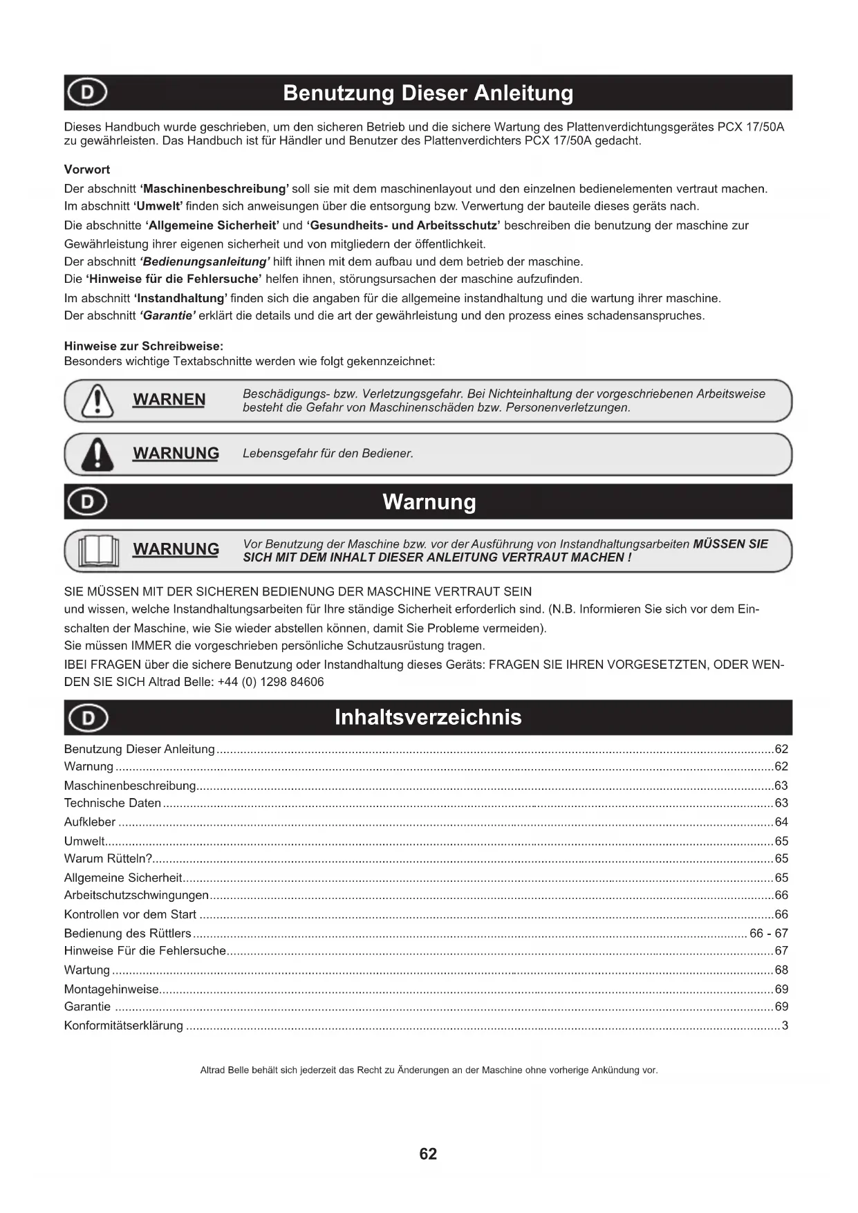 - Motortændrør Altrad Belle og/eller deres udnævnte agenter, direktører, ansatte eller forsikringsgiver kan ikke holdes ansvarlig for følgeskader eller anden skade, tab eller udgifter i forbindelse med eller som følge af eller manglende mulighed for at bruge maskinen til noget formål. Garantikrav Alle garantikrav bør først anmeldes til Altrad Belle enten per telefon, per fax, per email, eller per brev. For garantikrav: Tlf.: +44(0)1298 84606 Fax: +44(0)1298 84073 Email : Warranty@belle-group.co.uk Skriv til: Altrad Belle Warranty Department Sheen, Nr. Buxton Derbyshire SK17 0EU England Garantiregistrering: Som led i vores bestræbelser på at gøre ALTRAD Belle grønnere og mere miljøvenligt har vi indført garantiregistrering online. For at gå til registreringssiden på vores webside bedes du bruge følgende adresse: http://www.bellegroup.com/index.php?p=warranty_registration Alternativt bedes du skanne QR-koden (Quick Response Code) ved siden af denne tekst med din smartphone for at få adgang til registreringssiden. Garanti62 Benutzung Dieser Anleitung Inhaltsverzeichnis Beschädigungs- bzw. Verletzungsgefahr. Bei Nichteinhaltung der vorgeschriebenen Arbeitsweise besteht die Gefahr von Maschinenschäden bzw. Personenverletzungen. WARNEN Lebensgefahr für den Bediener. WARNUNG Warnung SIE MÜSSEN MIT DER SICHEREN BEDIENUNG DER MASCHINE VERTRAUT SEIN und wissen, welche Instandhaltungsarbeiten für Ihre ständige Sicherheit erforderlich sind. (N.B. Informieren Sie sich vor dem Ein- schalten der Maschine, wie Sie wieder abstellen können, damit Sie Probleme vermeiden). Sie müssen IMMER die vorgeschrieben persönliche Schutzausrüstung tragen. IBEI FRAGEN über die sichere Benutzung oder Instandhaltung dieses Geräts: FRAGEN SIE IHREN VORGESETZTEN, ODER WEN- DEN SIE SICH Altrad Belle: +44 (0) 1298 84606 Vor Benutzung der Maschine bzw. vor der Ausführung von Instandhaltungsarbeiten MÜSSEN SIE SICH MIT DEM INHALT DIESER ANLEITUNG VERTRAUT MACHEN ! WARNUNG Benutzung Dieser Anleitung .....................................................................................................................................................................62 Warnung ...................................................................................................................................................................................................62 Maschinenbeschreibung...........................................................................................................................................................................63 Technische Daten .....................................................................................................................................................................................63 Aufkleber ..................................................................................................................................................................................................64 Umwelt ......................................................................................................................................................................................................65 Warum Rütteln? ........................................................................................................................................................................................65 Allgemeine Sicherheit ...............................................................................................................................................................................65 Arbeitschutzschwingungen .......................................................................................................................................................................66 Kontrollen vor dem Start ..........................................................................................................................................................................66 Bedienung des Rüttlers .................................................................................................................................................................... 66 - 67 Hinweise Für die Fehlersuche ..................................................................................................................................................................67 Wartung ....................................................................................................................................................................................................68 Montagehinweise......................................................................................................................................................................................69 Garantie ...................................................................................................................................................................................................69 Konformitätserklärung ................................................................................................................................................................................3 Altrad Belle behält sich jederzeit das Recht zu Änderungen an der Maschine ohne vorherige Ankündung vor. Dieses Handbuch wurde geschrieben, um den sicheren Betrieb und die sichere Wartung des Plattenverdichtungsgerätes PCX 17/50A zu gewährleisten. Das Handbuch ist für Händler und Benutzer des Plattenverdichters PCX 17/50A gedacht. Vorwort Der abschnitt ‘Maschinenbeschreibung’ soll sie mit dem maschinenlayout und den einzelnen bedienelementen vertraut machen. Im abschnitt ‘Umwelt’ ¿ nden sich anweisungen über die entsorgung bzw. Verwertung der bauteile dieses geräts nach. Die abschnitte ‘Allgemeine Sicherheit’ und ‘Gesundheits- und Arbeitsschutz’ beschreiben die benutzung der maschine zur Gewährleistung ihrer eigenen sicherheit und von mitgliedern 