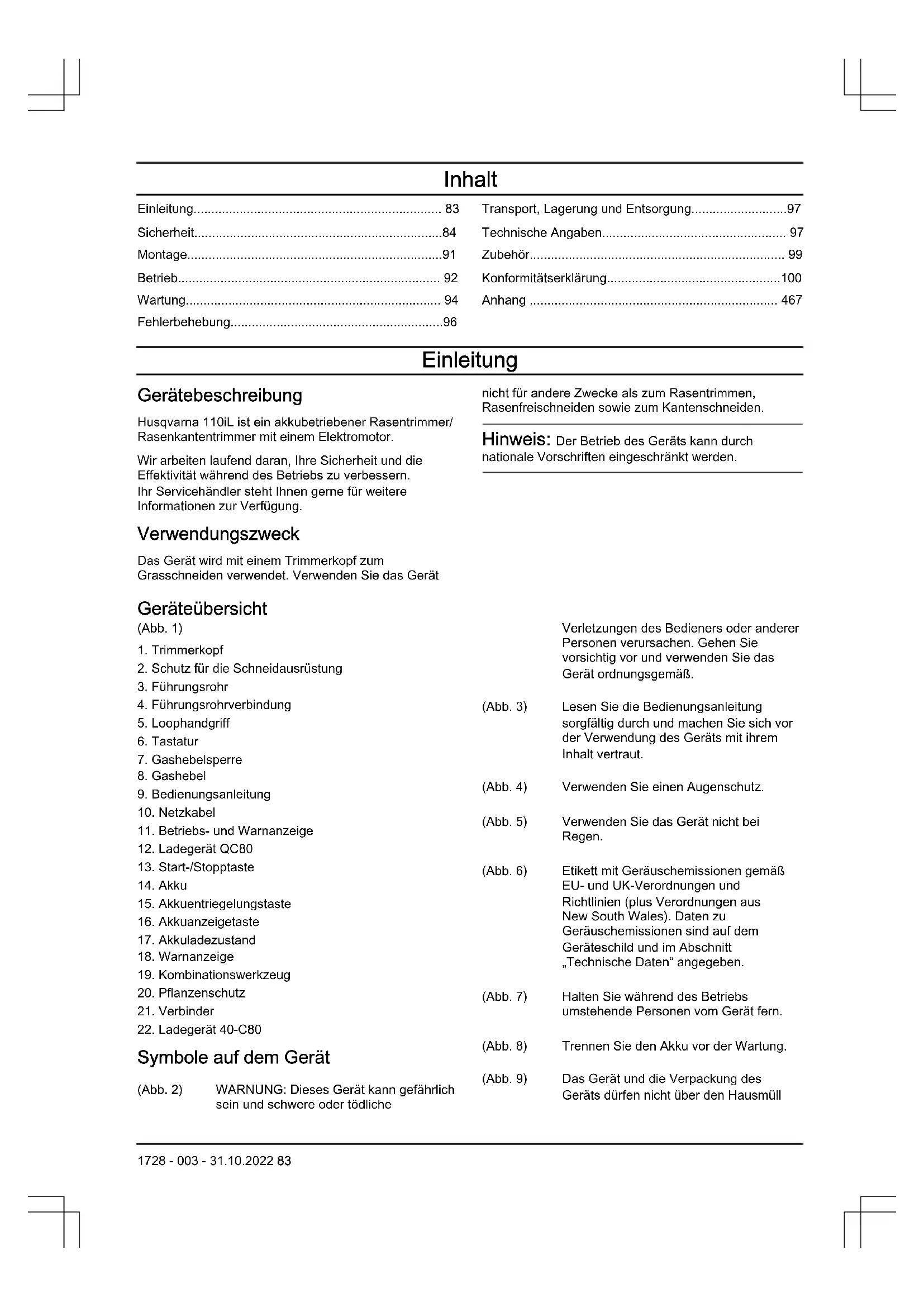 98 1728 - 003 - 31.10.2022Akkuladegerät QC80 40-C80 Leistung, W 100 72 Ausgangsspannung, V DC/ Ampere, A 36/2 43/1,6 Zubehör Zugelassenes Zubehör Zugelassenes Zubehör Typ Schutz für die Schneidausrüstung, Teile-Nr. Trimmerkopf A15BM5 (Faden-Ø 1,6 mm) 534 98 40-01 1728 - 003 - 31.10.2022 99Konformitätserklärung EU-Konformitätserkärung Die Husqvarna AB, SE-561 82 Huskvarna, Schweden, Tel.: +46-36-146500, erklärt in alleiniger Verantwortung, dass das Gerät: Beschreibung Akkubetriebener Rasentrimmer/Rasenkantentrimmer Marke Husqvarna Typ/Modell 110iL Identifizierung Seriennummern ab 2022 die folgenden EU-Richtlinien und -Verordnungen erfüllt: Richtlinie/Verord- nung Beschreibung 2006/42/EG „Maschinenrichtlinie“ 2014/30/EG „über elektromagnetische Verträglichkeit“ 2000/14/EG „über umweltbelastende Geräuschemissionen von zur Verwendung im Freien vorgesehenen Geräten und Maschinen“ 2011/65/EG „zur Beschränkung der Verwendung bestimmter gefährlicher Stoffe in Elektro- und Elektron- ikgeräten“ und dass die folgenden Normen und/oder technischen Daten angewendet werden: EN 60335-1:2012+A11:2014+A13:2017+A14:2019+A1:2019 +A2:2019, EN 50636-2-91:2014, EN IEC 63000:2018, EN 55014-1:2017+A11; EN 55014-2:2015. Benannte Stelle: 0197 TÜV Rheinland LGA Products GmbH, Tillystraße 2, 90431 Nürnberg, Germany bestätigte die Konformität mit der Richtlinie 2000/14/EG, Konformitätsbewertungsverfahren nach: Anhang VI. Informationen zu Geräuschemission finden Sie unter Technische Daten auf Seite 97