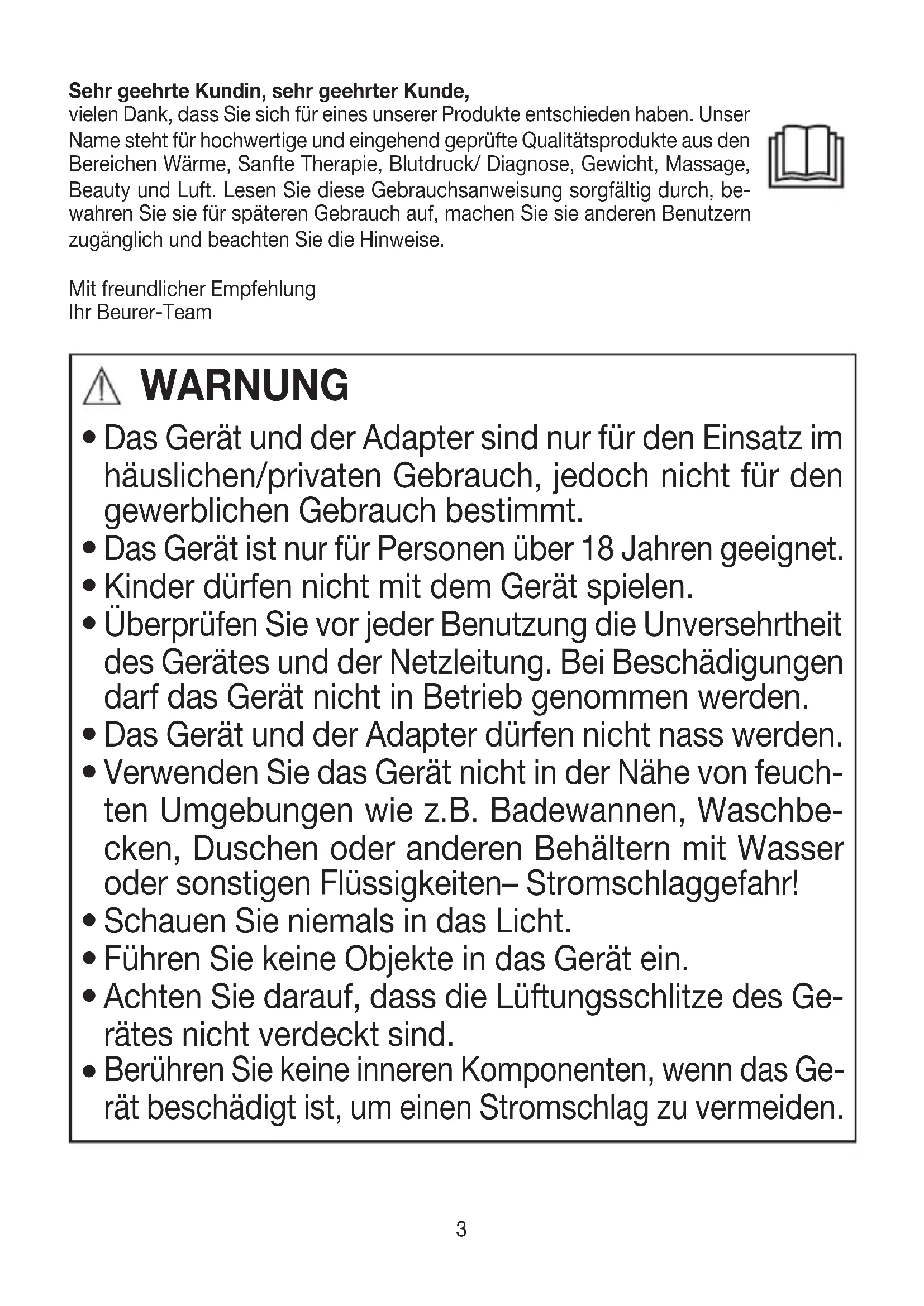 12. Netzteil ............................................................................................................23 13. Garantie ..........................................................................................................23 DEUTSCH3 Sehr geehrte Kundin, sehr geehrter Kunde, vielen Dank, dass Sie sich für eines unserer Produkte entschieden haben. Unser Name steht für hochwertige und eingehend geprüfte Qualitätsprodukte aus den Bereichen Wärme, Sanfte Therapie, Blutdruck/ Diagnose, Gewicht, Massage, Beauty und Luft. Lesen Sie diese Gebrauchsanweisung sorgfältig durch, be- wahren Sie sie für späteren Gebrauch auf, machen Sie sie anderen Benutzern zugänglich und beachten Sie die Hinweise. Mit freundlicher Empfehlung Ihr Beurer-Team WARNUNG