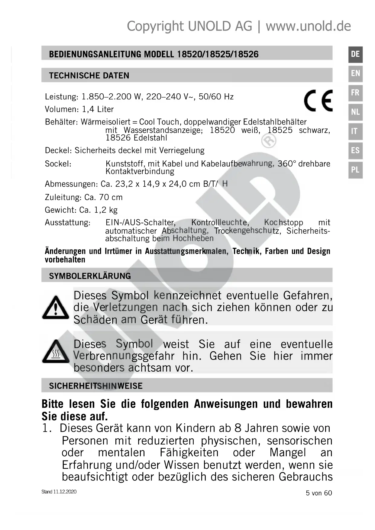 Gefahren für den Benutzer führen und haben den Ausschluss der Garantie zur Folge. Vorsicht! Nicht den Deckel öffnen, während das Wasser kocht. Wenn der Behälter überfüllt wird, kann kochendes Wasser herausspritzen. Das Gerät ist während und nach dem Betrieb sehr heiß! Öffnen Sie auf keinen Fall das Gehäuse des Gerätes. Es besteht die Gefahr eines Stromschlages. Das Gerät darf nur mit dem mitgelieferten Sockel ver- wendet werden. Copyright UNOLD AG | www.unold.deStand 11.12.2020 9 von 60