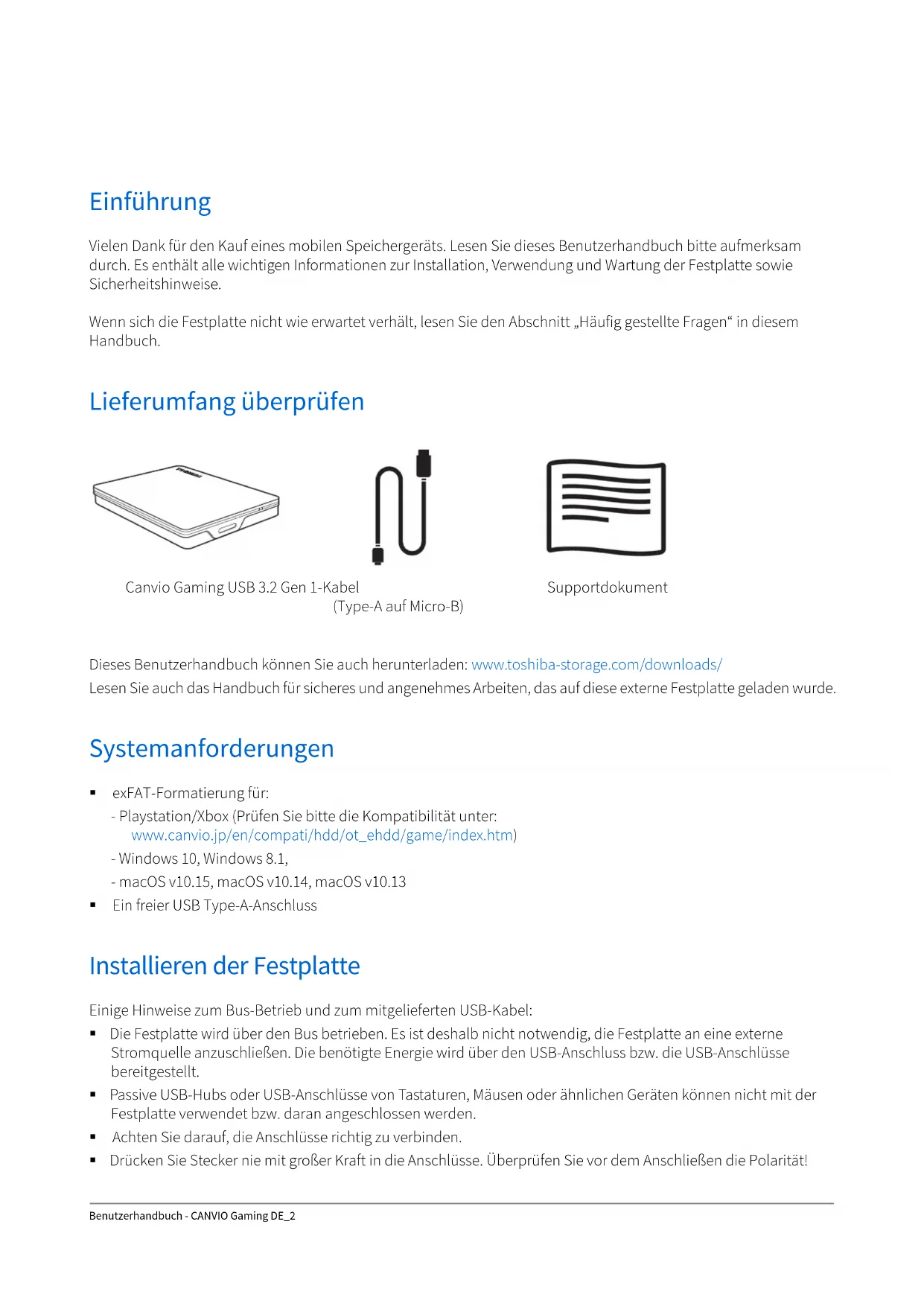 - Zulassungsbestimmungen Benutzerhandbuch - CANVIO Gaming DE_2 Einführung Vielen Dank für den Kauf eines mobilen Speichergeräts. Lesen Sie dieses Benutzerhandbuch bitte aufmerksam durch. Es enthält alle wichtigen Informationen zur Installation, Verwendung und Wartung der Festplatte sowie Sicherheitshinweise. Wenn sich die Festplatte nicht wie erwartet verhält, lesen Sie den Abschnitt „Häufig gestellte Fragen“ in diesem Handbuch. Lieferumfang überprüfen Dieses Benutzerhandbuch können Sie auch herunterladen: www.toshiba-storage.com/downloads/ Lesen Sie auch das Handbuch für sicheres und angenehmes Arbeiten, das auf diese externe Festplatte geladen wurde. Systemanforderungen exFAT-Formatierung für: - Playstation/Xbox (Prüfen Sie bitte die Kompatibilität unter: www.canvio.jp/en/compati/hdd/ot_ehdd/game/index.htm) - Windows 10, Windows 8.1, - macOS v10.15, macOS v10.14, macOS v10.13 Ein freier USB Type-A-Anschluss Installieren der Festplatte Einige Hinweise zum Bus-Betrieb und zum mitgelieferten USB-Kabel: Die Festplatte wird über den Bus betrieben. Es ist deshalb nicht notwendig, die Festplatte an eine externe Stromquelle anzuschließen. Die benötigte Energie wird über den USB-Anschluss bzw. die USB-Anschlüsse bereitgestellt. Passive USB-Hubs oder USB-Anschlüsse von Tastaturen, Mäusen oder ähnlichen Geräten können nicht mit der Festplatte verwendet bzw. daran angeschlossen werden. Achten Sie darauf, die Anschlüsse richtig zu verbinden. Drücken Sie Stecker nie mit großer Kraft in die Anschlüsse. Überprüfen Sie vor dem Anschließen die Polarität! Canvio Gaming USB 3.2 Gen 1-Kabel (Type-A auf Micro-B) SupportdokumentBenutzerhandbuch - CANVIO Gaming DE_3 Anschließen des Laufwerks an ein kompatibles Gerät Überprüfen Sie die Kompatibilität des Geräts und lesen Sie die Anschlussanleitungen im Benutzerhandbuch des Geräts. p. 6