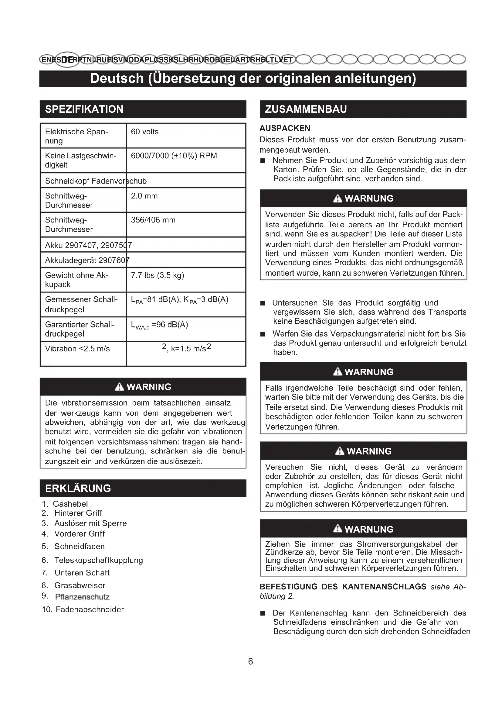 EN ES IT FR PT NL RU FI SV NO DA PL CS SK SL HR HU RO BG EL AR TR HE LT LV ET SPEZIFIKATION Elektrische Span- nung 60 volts Keine Lastgeschwin- digkeit 6000/7000 (±10%) RPM Schneidkopf Fadenvorschub Schnittweg- Durchmesser