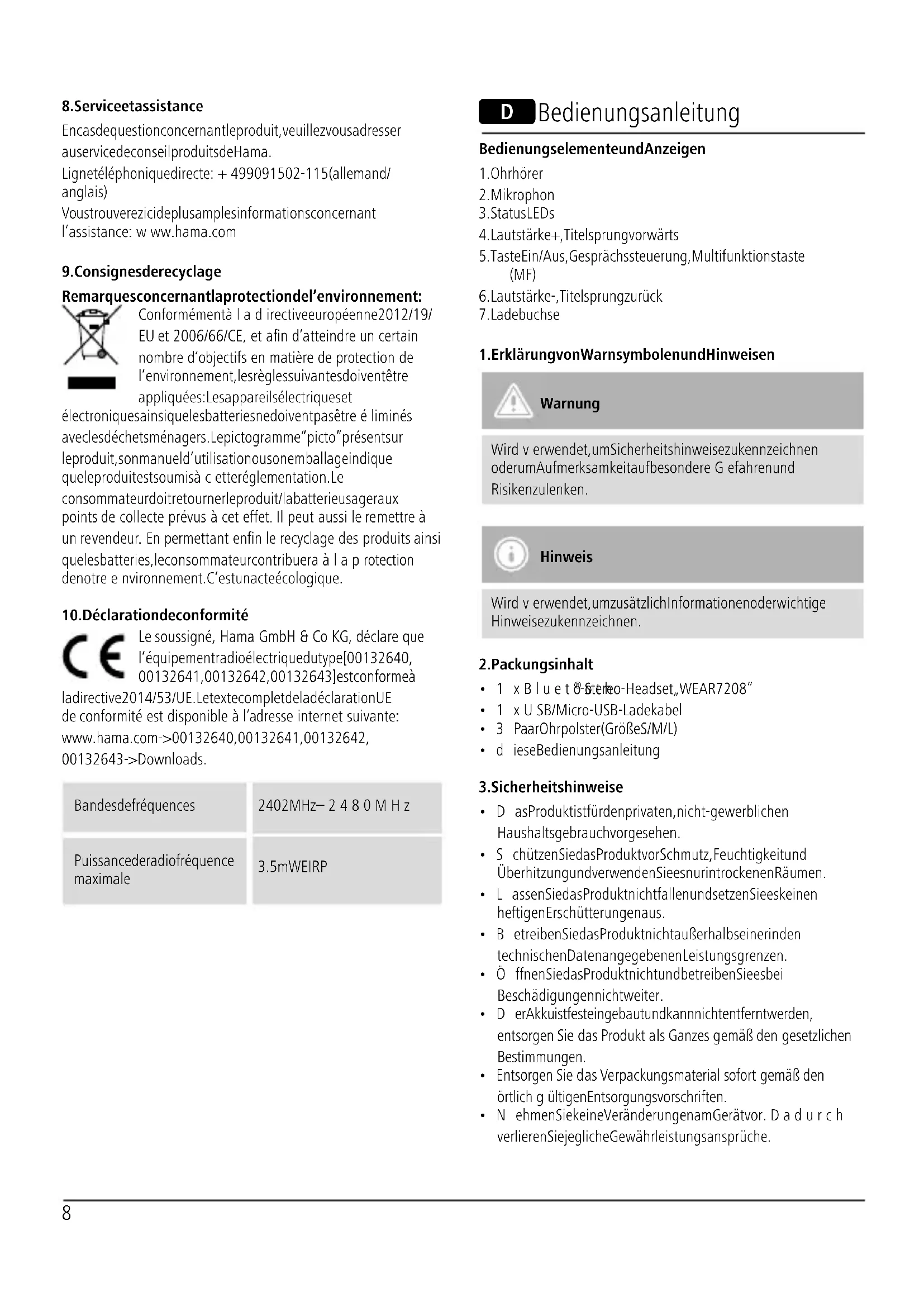 - Die Benutzung des Produktes schränkt Sie in der Wahrnehmung von Umgebungsgeräuschen ein. Bedienen Sie daher während der Benutzung keine Fahrzeuge oder Maschinen.