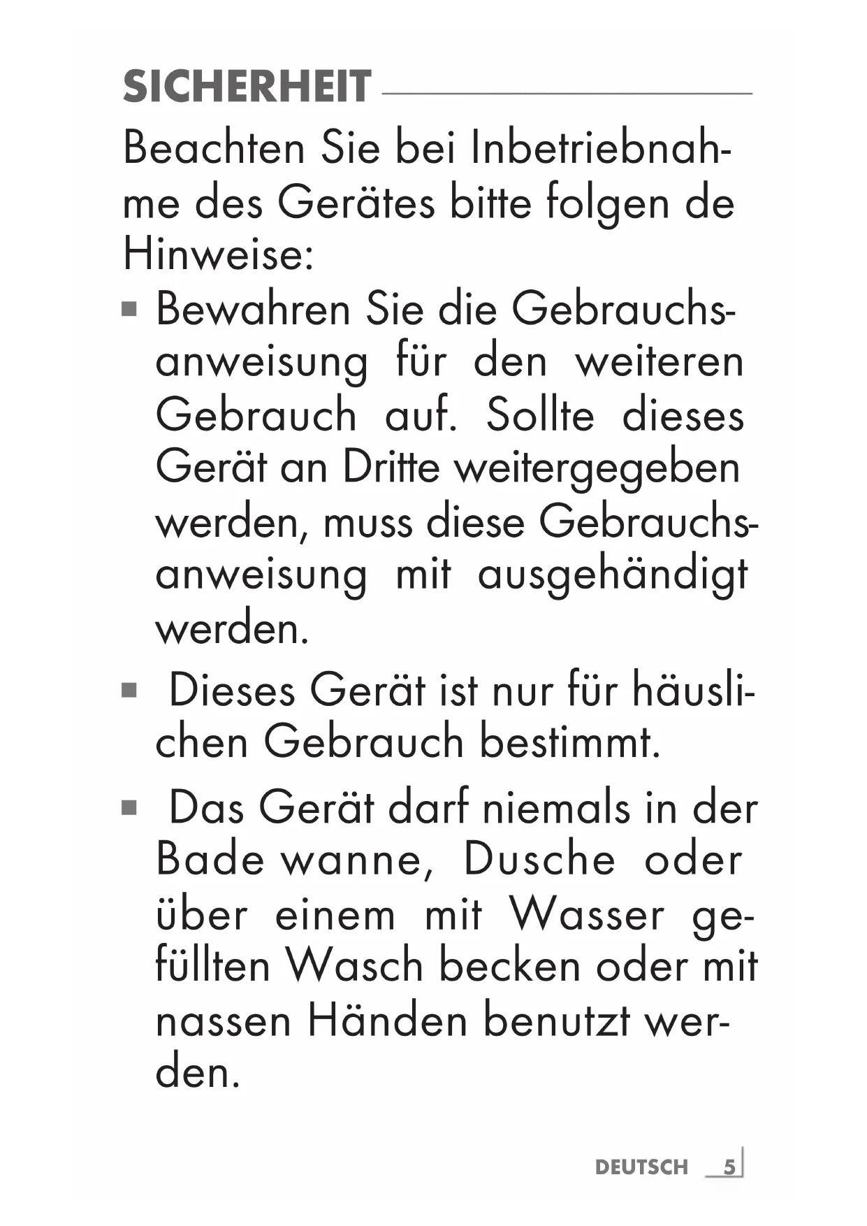 Wird das Gerät im Bad be- nutzt, ist unbedingt darauf zu achten, dass der Netzstecker nach Gebrauch gezogen wird, da die Nähe von Was- ser auch bei ausgeschaltetem Gerät eine Gefahr darstellt. SICHERHEIT