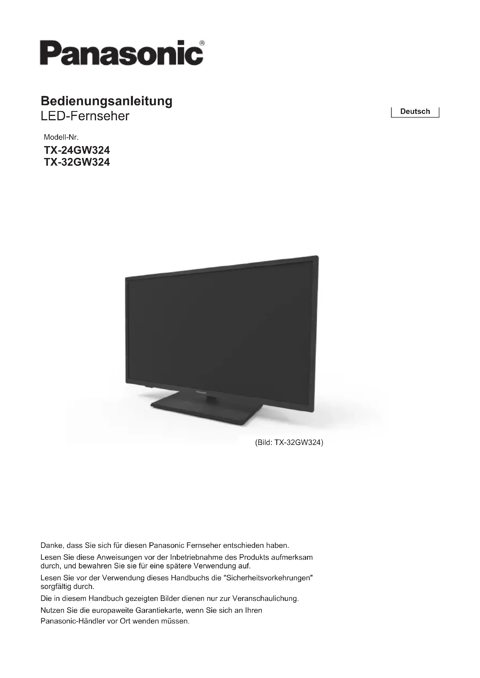 Wenn Sie Unterstützung benötigen, wenden Sie sich an Ihren Panasonic-Händler vor Ort. Wenn Sie eine Anfrage von einem Ort aus stellen, an dem dieser Fernseher nicht vertrieben wird, können wir nicht auf Anfragen antworten, die inhaltlich eine visuelle Bestätigung des Anschlusses, des Problems usw. am Fernseher selbst erfordern.32 Deutsch Wartung Ziehen Sie zuerst den Netzstecker aus der Steckdose. Bildschirm, Gehäuse, Sockel Regelmäßige Pflege:Wischen Sie die Oberfläche des Bildschirms, Gehäuses oder Sockels vorsichtig mit einem weichen Tuch ab, um Schmutz oder Fingerabdrücke zu entfernen.Bei hartnäckigem Schmutz:(1) Reinigen Sie zuerst den Staub von der Oberfläche.(2) Befeuchten Sie ein weiches Tuch mit sauberem Wasser oder verdünntem neutralem Reinigungsmittel (1 Teil Reinigungsmittel und 100 Teile Wasser).(3) Wringen Sie das Tuch fest aus. (Achten Sie darauf, dass keine Flüssigkeit in das Innere des Fernsehers gelangt, da dies zu einem Gerätefehler führen kann.)(4) Wischen Sie hartnäckigen Schmutz vorsichtig mit dem feuchten Tuch ab.(5) Wischen Sie abschließend die gesamte Feuchtigkeit ab.Vorsicht Verwenden Sie kein hartes Tuch, und reiben Sie die Oberfläche nicht zu hart, da dies zu Kratzern auf der Oberfläche führen kann. Achten Sie darauf, dass die Oberflächen nicht mit Insektenschutz- oder Lösungsmitteln, Verdünnern oder anderen flüchtigen Substanzen in Kontakt kommen. Dadurch kann die Oberflächenqualität beeinträchtigt werden oder die Farbe kann sich ablösen. Die Oberfläche des Bildschirms ist speziell behandelt und kann leicht beschädigt werden. Achten Sie darauf, dass Sie die Oberfläche nicht mit dem Fingernagel oder anderen harten Gegenständen berühren oder verkratzen. Gehäuse und Sockel dürfen nicht über einen längeren Zeitraum mit einer Gummi- oder PVC-haltigen Substanz in Berührung kommen. Dadurch kann die Oberflächenqualität beeinträchtigt werden. Netzstecker Wischen Sie den Netzstecker regelmäßig mit einem trockenen Tuch ab. Feuchtigkeit und Staub können zu Bränden oder Stromschlägen führen. Technische Daten ■ Fernseher Modell-Nr. 24-Zoll-ModellTX-24GW32432-Zoll-ModellTX-32GW324 Abmessungen (B x H x T) 24-Zoll-Modell556 mm × 393 mm × 176 mm (mit Sockel)556 mm × 344 mm × 68 mm (nur Fernseher)32-Zoll-Modell732 mm × 487 mm × 195 mm (mit Sockel)732 mm × 438 mm × 77 mm (nur Fernseher) Gewicht 24-Zoll-Modell3,36 kg (mit Sockel)3,09 kg (nur Fernseher)32-Zoll-Modell4,91 kg (mit Sockel)4,41 kg (nur Fernseher) Stromversorgung AC: 220–240 V, 50/60 Hz Bildschirm LED-LCD-Bildschirm Ton Lautsprecherausgang24-Zoll-Modell6 W (3 W + 3 W)32-Zoll-Modell10 W (5 W + 5 W)Kopfhörer3,5-mm-Stereo-Miniklinkenbuchse × 133 Deutsch Anschlüsse SCART (RGB/CVBS) SCART-Adapter HDMI 1/2-Input Steckverbinder Typ A HDMI 1: Content Type, Audio Return Channel, Deep Colour, x.v.Colour™ HDMI 2: Content Type, Deep Colour, x.v.Colour™ Kartensteckplatz Common Interface-Steckplatz (entspricht CI Plus) × 1 USB DC 5 V, max. 500 mA [Hi-Speed USB (USB 2.0)] DIGITAL AUDIO-Output PCM/Dolby Digital, Glasfaser Empfangssysteme/Bandname DVB-C Digitale Kabeldienste (MPEG2, MPEG4- AVC (H.264) und MPEG HEVC) DVB-T/T2 Digitale terrestrische Dienste (MPEG2, MPEG4- AVC (H.264) und MPEG HEVC)