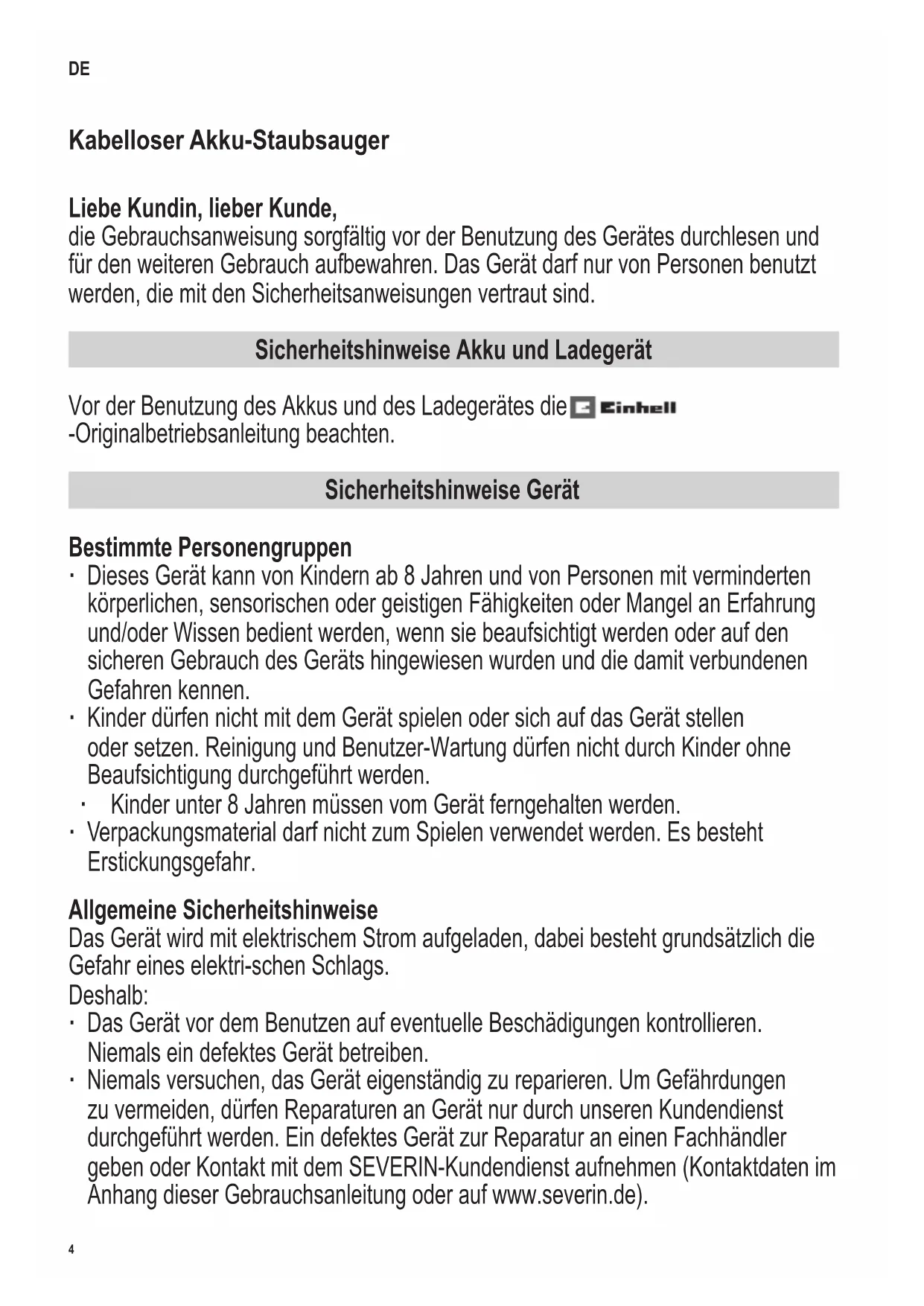 der Erhebung einrastet.10 142 x 208 mm Probleme selbst beheben Damit möglichst gar keine Probleme auftreten, ist es wichtig, rechtzeitig den Staubbeutel zu wechseln, bzw. den Staubbehälter zu leeren sowie bei dieser Gelegenheit die Filter zu kontrollieren und zu reinigen. Problem mögliche Ursache / Lösung Gerät lässt sich nicht einschalten. Akku ist völlig leer. Gerät ausschalten und Akku laden, Kapitel „Akku laden“. Gerät nimmt kaum Schmutz auf. Staubbeutel/Staubbehälter muss geleert oder Filter und Staubbehälter müssen gereinigt werden, Kapitel „Gerät warten“. Die Düse ist verstopft. Überprüfen, ob der Saugkanal in der Düse frei ist. Das Saugrohr ist verstopft. Überprüfen, ob das Saugrohr frei ist. Der Saugkanal im Gerät ist blockiert. Überprüfen, ob der Saugkanal an der Gerätevorderseite frei ist. Die Staubkontrollleuchte leuchtet rot. Staubbeutel/Staubbehälter muss geleert werden. Leuchtet die Leuchte weiterhin rot muss das Gerät zerlegt werden, um eine eventuelle Verstopfung im Saugrohr, in den Filtern etc. zu beseitigen. Betriebsdauer ver- kürzt sich zuneh- mend. Bürstwalze ist verschmutzt und muss gereinigt werden, Kapitel „Bürstwalze reinigen“. Bürstwalze dreht sich langsam oder unregelmäßig. Bürstwalze ist verschmutzt und muss gereinigt werden, Kapitel „Bürstwalze reinigen“. Bürstwalze und LEDs schalten sich selbstständig aus. Es handelt sich hierbei um eine Sicherheitsfunktion, die einen Defekt an der Düse bei verklemmter Bürstwalze verhindert. Entweder ist die Bürstwalze verschmutzt und muss gereinigt werden, Kapitel „Bürstwalze reinigen“ oder etwas hat sich in der Bürstwalze verklemmt, z.B. beim Absaugen eines hochorigen Teppichs. Um die Abschaltung aufzuheben, schalten Sie den Staubsauger aus, nehmen die Düse vom Saugrohr bzw. dem Handstaubsauger ab und entfernen eventuelle Gegenstände, die die Bürstwalze blockieren. Nach erneutem Einschalten funktionieren Bürstwalze und LEDs wieder wie gewohnt. Servicehotline Falls Sie das Problem anhand der Tabelle nicht beheben können, rufen Sie für Probleme am Gerät unsere Servicehotline an (siehe Kontaktdaten im Anhang dieser Gebrauchsanleitung). Bei Problemen mit dem Akku oder dem Ladegerät wenden Sie sich an die -Servicehotline (siehe separate -Originalbetriebsanleitung) Ersatzteile und Zubehör Ersatzteile oder Zubehör können bequem im Internet auf unserer Homepage www.severin.de unter dem Unterpunkt „Service / Ersatzteile“ bestellt werden. Für die beutellosen Geräte kann ein Staubbehälter für Staubbeutel nachgerüstet werden und für die Geräte mit Staubbeutel ein beutelloser Staubbehälter.11 142 x 208 mm Artikelnummer Beschreibung ZB 7260 Ersatzakku 2.5 Ah ZB 7261 Ersatzakku 3.0 Ah ZB 7262 Filterset (Hepa-Filter und Filter Staubbehälter) ZB 7263 Staubbeutelset (6 Staubbeutel) ZB 7264 Turbo-Polsterdüse ZB 7265 Hartbodendüse mit Soft-Bürstwalze ZB 7266 Variable Möbeldüse ZB 7267 Staubbehälter beutellos ZB 7268 Staubbehälter mit Beutel 5729-048 HEPA-Filter, einzeln 5731-048 Bodendüse mit Bürstwalze 5732-048 Bürstwalze für Bodendüse 5731-048 9168-048 Netzteil 5734-048 Soft-Bürstwalze für Hartbodendüse ZB 7265 Entsorgung und Garantie Gerät und Akku separat entsorgen Geräte und Akkus, die mit diesem Symbol gekennzeichnet sind, müssen getrennt vom Hausmüll entsorgt werden! Geräte und Akkus enthalten wertvolle Rohstoffe, die wiederverwertet werden können. Eine ordnungsgemäße Entsorgung schützt die Umwelt und die Gesundheit Ihrer Mitmenschen. Gerät und den ausgebauten Akku separat zur Entsorgung an die entsprechenden Sammelstellen geben. Garantie (Gerät) Von den nachfolgenden Garantiebedingungen bleiben die gesetzlichen Gewährleistungsrechte gegenüber dem Verkäufer und eventuelle Verkäufergarantien unberührt. Wenden Sie sich im Garantiefall daher direkt an den Fachhändler. Zusätzlich gewährt SEVERIN eine Herstellergarantie von zwei Jahren ab Kaufdatum. In diesem Zeitraum beseitigen wir kostenlos alle Mängel, die nachweislich auf Material- oder Fertigungsfehlern beruhen und die Funktion wesentlich beeinträchtigen. Weitere Ansprüche sind ausgeschlossen. Von der Garantie ausgenommen sind: Schäden, die auf Nichtbeachtung der Gebrauchsanweisung, unsachgemäße Behandlung oder normalen Verschleiß zurückzuführen sind, ebenso leicht zerbrechliche Teile wie z. B. Glas, Kunststoff oder Glühlampen. Von der Garantie ausgenommen sind außerdem Batterien und Akkus, die infolge normalen Verschleißes oder unsachgemäßer Handhabung defekt geworden sind bzw. deren Laufzeit sich verkürzt hat. Die Garantie erlischt bei Eingriff nicht von SEVERIN autorisierter Stellen. Sollte eine Reparatur erforderlich werden, setzen Sie sich bitte telefonisch oder per Mail mit unserem Kundendienst in Verbindung. Die Kontaktdaten nden Sie im Anhang der Anleitung. Garantie (Akku und Ladegerät) Informationen zur Garantie von Akku und Ladegerät können der separat beiliegenden -Originalbetriebsanleitung entnommen werden.12 142 x 208 mm Wireless vacuum cleaner with rechargeable battery Dear Customer, Before using the appliance, read the following instructions carefully and keep this manual for future reference. The appliance must only be used by those familiar with the instructions below. Safety information on battery and charger Read carefully the -original instructions for use before using the battery and charger. Safety information on the appliance Certain groups of persons ∙ This appliance may only be operated by children over the age of 8 and by persons with reduced physical, sensory or mental capacities or a lack of experience and/or knowledge if they are supervised or have been instructed about the safe use of the appliance and are aware of the dangers associated with its use. ∙ Children are not allowed to play with the appliance or stand or sit on it. ∙ Cleaning and user maintenance shall not be carried out by children without supervision. 
