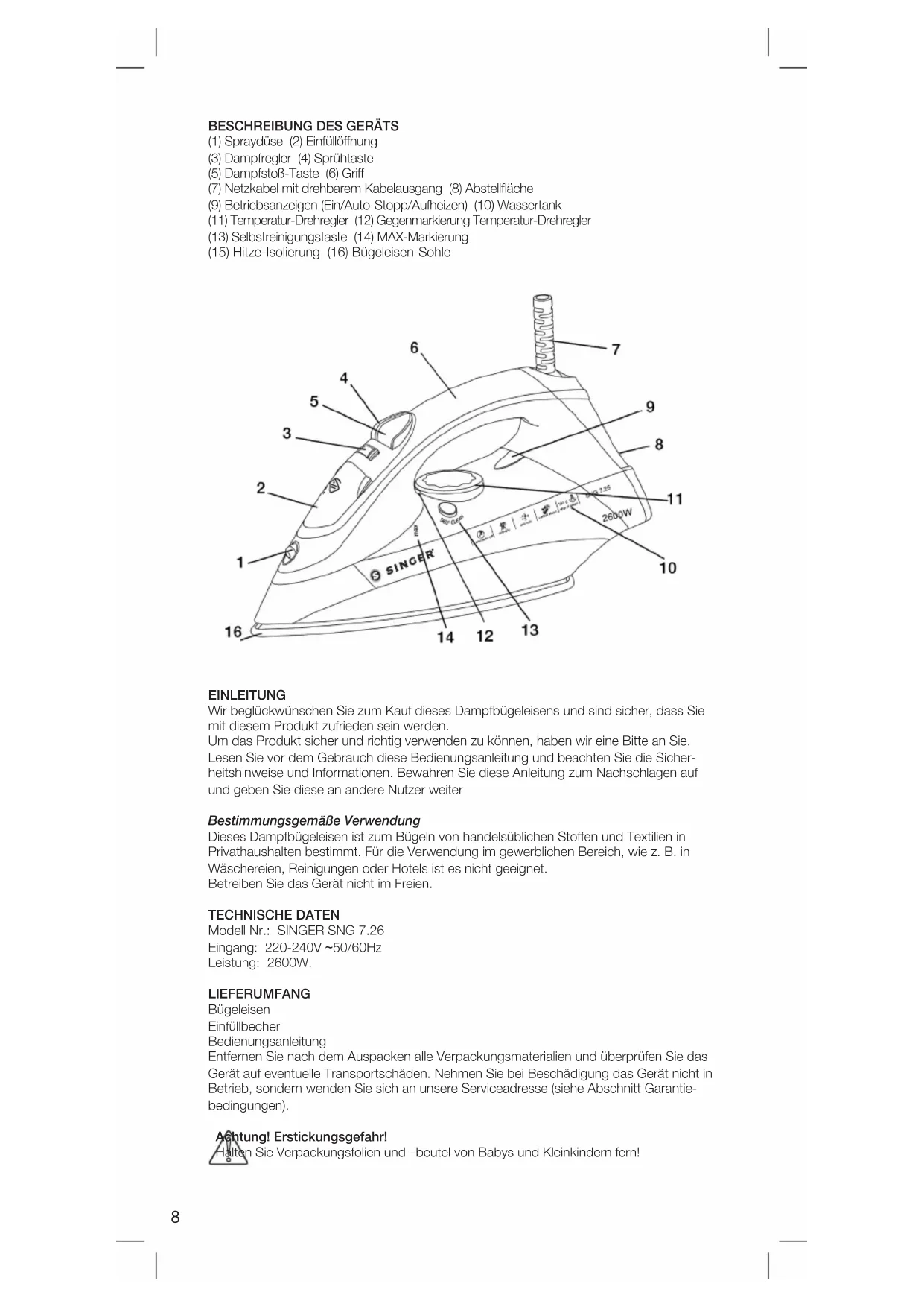 (1) Spraydüse (2) Einfüllöffnung (3) Dampfregler (4) Sprühtaste (5) Dampfstoß-Taste (6) Griff (7) Netzkabel mit drehbarem Kabelausgang (8) Abstellfläche (9) Betriebsanzeigen (Ein/Auto-Stopp/Aufheizen) (10) Wassertank (11) Temperatur-Drehregler (12) Gegenmarkierung Temperatur-Drehregler (13) Selbstreinigungstaste (14) MAX-Markierung (15) Hitze-Isolierung (16) Bügeleisen-Sohle EINLEITUNG Wir beglückwünschen Sie zum Kauf dieses Dampfbügeleisens und sind sicher, dass Sie mit diesem Produkt zufrieden sein werden. Um das Produkt sicher und richtig verwenden zu können, haben wir eine Bitte an Sie. Lesen Sie vor dem Gebrauch diese Bedienungsanleitung und beachten Sie die Sicher- heitshinweise und Informationen. Bewahren Sie diese Anleitung zum Nachschlagen auf und geben Sie diese an andere Nutzer weiter Bestimmungsgemäße Verwendung Dieses Dampfbügeleisen ist zum Bügeln von handelsüblichen Stoffen und Textilien in Privathaushalten bestimmt. Für die Verwendung im gewerblichen Bereich, wie z. B. in Wäschereien, Reinigungen oder Hotels ist es nicht geeignet. Betreiben Sie das Gerät nicht im Freien. TECHNISCHE DATEN Modell Nr.: SINGER SNG 7.26 Eingang: 220-240V ~50/60Hz Leistung: 2600W. LIEFERUMFANG Bügeleisen Einfüllbecher Bedienungsanleitung Entfernen Sie nach dem Auspacken alle Verpackungsmaterialien und überprüfen Sie das Gerät auf eventuelle Transportschäden. Nehmen Sie bei Beschädigung das Gerät nicht in Betrieb, sondern wenden Sie sich an unsere Serviceadresse (siehe Abschnitt Garantie- bedingungen). Achtung! Erstickungsgefahr! Halten Sie Verpackungsfolien und –beutel von Babys und Kleinkindern fern!9 SICHERHEITSHINWEISE Dieses Gerät kann von Kindern ab 8 Jahren und von Personen mit reduzierten physis- chen, sensorischen oder mentalen Fähigkeiten oder Mangel an Erfahrung und/oder Wis- sen benutzt werden, wenn sie beaufsichtigt oder bezüglich des sicheren Gebrauchs des Gerätes unterwiesen wurden und die daraus resultierenden Gefahren verstanden haben. Kinder dürfen nicht mit dem Gerät spielen. Reinigung und Benutzerwartung dürfen nicht durch Kinder ohne Beaufsichtigung durch- geführt werden. Das Bügeleisen darf nicht unbeaufsichtigt gelassen werden, während es am Netz ange- schlossen ist. Ziehen Sie den Stecker aus der Steckdose - vor dem Füllen des Wassertanks mit Wasser, - vor Reinigungs- und Wartungsarbeiten, - wenn Sie das Gerät verlassen. Ziehen Sie immer am Stecker und nie am Kabel. Die Füllöffnung darf während des Gebrauchs nicht geöffnet werden. Das Bügeleisen muss auf einer stabilen Oberfläche benutzt und abgestellt werden. Wenn das Bügeleisen auf die Abstellvorrichtung gestellt wird, ist sicherzustellen, dass die Fläche, auf der die Abstellvorrichtung steht, stabil ist. Das Bügeleisen darf nicht benutzt werden, falls es heruntergefallen ist, wenn es sichtbare Beschädigungen aufweist oder undicht ist. Das Bügeleisen und dessen Anschlussleitung müssen während des Einschaltens und Abkühlens außer Reichweite von Kindern sein, die jünger als 8 Jahre sind. Halten Sie das Netzkabel von scharfen Kanten und von der heißen Bügelsohle fern. Wenn das Netzkabel beschädigt ist, darf das Bügeleisen nicht mehr verwendet werden. Lassen Sie das beschädigte Netzkabel umgehend durch unseren Service oder eine ähnlich qualifizierte Person ersetzen, um Gefährdungen zu vermeiden. Verbrennungsgefahr! Die Oberflächen des Bügeleisens werden während des Betriebs heiß. GERÄTEEIGENSCHAFTEN Antikalk-System Ein spezieller Harzfilter im Wassertank macht das Wasser weicher und verhindert, dass sich Kalk auf der Bügeleisensohle bildet. Er ist ein permanenter Filter, der nicht ausge- tauscht werden muss. Bitte beachten Sie: Verwenden Sie ausschließlich Leitungswasser. Destilliertes bzw. demineralisiertes Wasser macht das „Zero-Calc“ Antikalk-System unwirksam, weil es seine physiochemischen Eigenschaften verändert. Verwenden Sie keine chemischen Zusatzstoffe, Duftstoffe oder Entkalker. Wenn die oben- stehenden Anweisungen nicht eingehalten werden, erlischt die Garantie. Tropf-Stopp Mit dem Tropf-Stopp-System können Sie sogar die empfindlichsten Stoffe perfekt bügeln. Bügeln Sie derartige Stoffe immer bei niedrigen Temperaturen. Dabei kann sich die Sohle so weit abkühlen, dass kein Dampf mehr entsteht, sondern Tropfen kochenden Wassers, die Flecken hinterlassen können. In einem solchen Fall unterbricht der Tropf-Stopp die weitere Wasserzufuhr und damit den Austritt von Wassertropfen. Auto-Stopp (Automatische Sicherheits-Abschaltung) Wenn das Bügeleisen längere Zeit nicht bewegt wird, schaltet sich das Heizelement automatisch aus. In diesem Fall wechselt die grüne Betriebsanzeige in die Auto-Stopp Anzeige und beginnt zu blinken. Zusätzlich sind sechs Tonsignale zu hören. In waagerechter Position auf der Bügelsohle wird der Auto-Stopp Modus nach 30 Sekun- den aktiviert, steht das Bügeleisen auf der Abstellfläche erfolgt der Auto-Stopp nach 8 Minuten. Wenn das Bügeleisen wieder bewegt wird, schaltet es sich wieder ein. Die grüne Betrie- bsanzeige leuchtet wieder dauerhaft und die gelbe Betriebsanzeige „Aufheizen“ leuchtet, bis die eingestellte Temperatur erreicht ist. Warten Sie, bis die gelbe Betriebsanzeige erlischt. Jetzt können Sie weiterbügeln. BEDIENUNG Allgemeine Hinweise Wenn Sie das Bügeleisen zum ersten Mal verwenden, bemerken Sie eventuell einen leichten Rauchaustritt oder Geräusche, die vom Ausdehnen von Plastikteilen stammen. DEU10 Dies ist völlig normal und hört nach kurzer Zeit wieder auf. Bevor Sie das Bügeleisen zum ersten Mal verwenden, empfehlen wir Ihnen, mit dem Bügeleisen ein altes Baumwollhandtuch mit der höchsten Temperatur- instellung und Dampffunktion zu bügeln, um mögliche Fertigungsrückstände vollständig zu entfernen. Anschließend das Bügeleisen abkühlen lassen und wie im Kapitel „Reinigung und Pflege“ beschrieben gründlich reinigen. Achtung! Verbrennungsgefahr! Fassen Sie das Büge