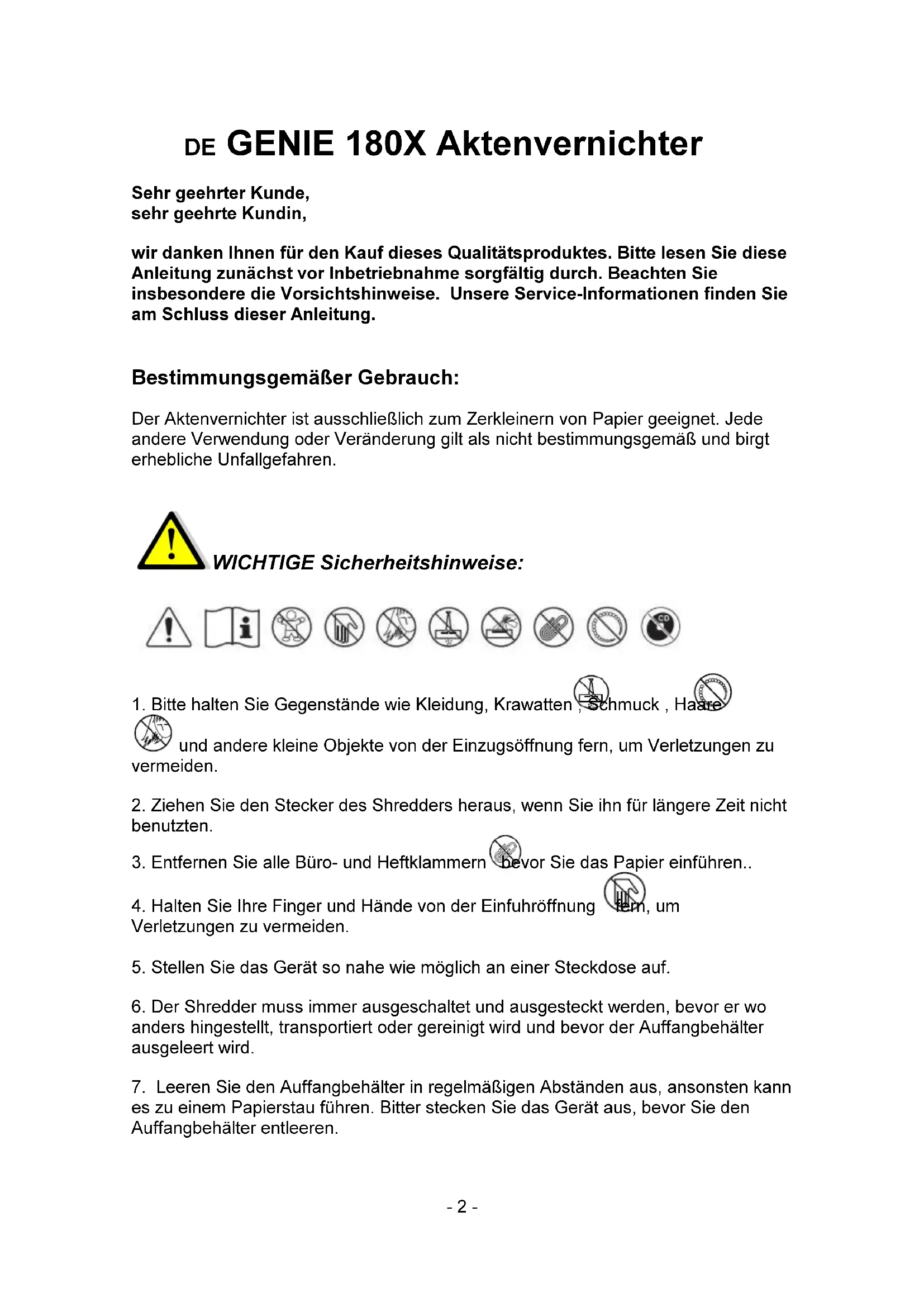 Version/ Versión/ Versione: 02/2017- 2 - DE GENIE 180X Aktenvernichter Sehr geehrter Kunde, sehr geehrte Kundin, wir danken Ihnen für den Kauf dieses Qualitätsproduktes. Bitte lesen Sie diese Anleitung zunächst vor Inbetriebnahme sorgfältig durch. Beachten Sie insbesondere die Vorsichtshinweise. Unsere Service-Informationen finden Sie am Schluss dieser Anleitung.