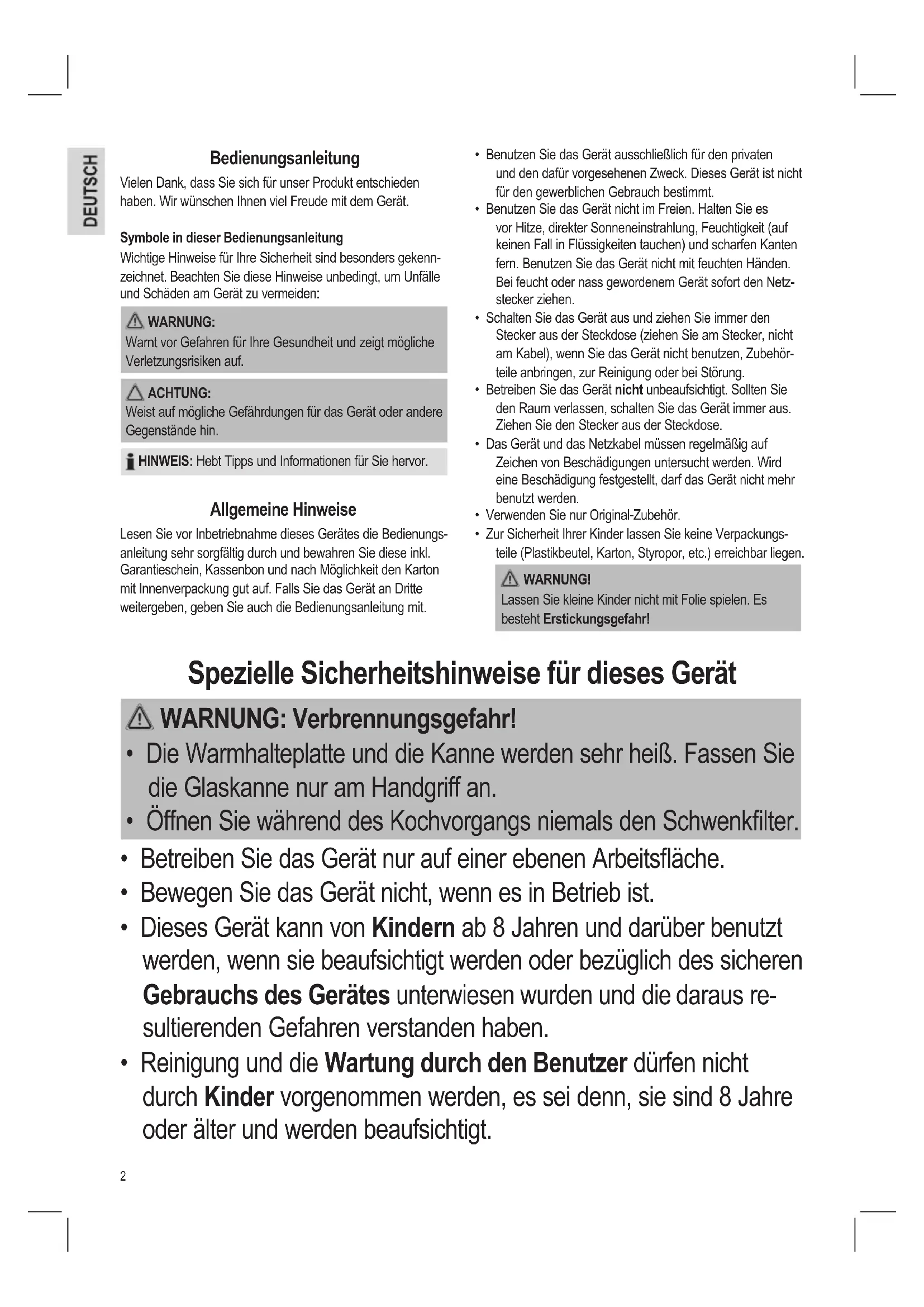 - Dieses Gerät dient zum Kochen von gemahlenem Bohnenkaffee.