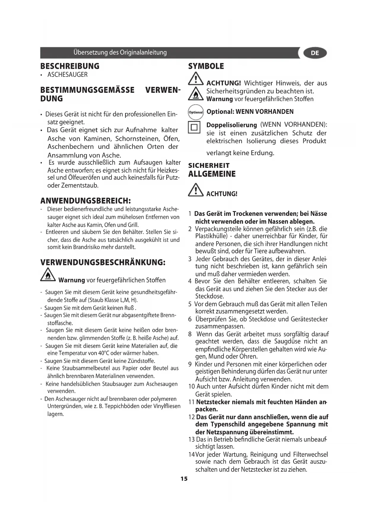 sel und Ölfeueröfen und auch keinesfalls für Putz- oder Zementstaub. ANWENDUNGSBEREICH: - Dieser bedienerfreundliche und leistungsstarke Asche- sauger eignet sich ideal zum mühelosen Entfernen von kalter Asche aus Kamin, Ofen und Grill. - Entleeren und säubern Sie den Behälter. Stellen Sie si- cher, dass die Asche aus tatsächlich ausgekühlt ist und somit kein Brandrisiko mehr darstellt. VERWENDUNGSBESCHRÄNKUNG: Warnung vor feuergefährlichen Stoffen - Saugen Sie mit diesem Gerät keine gesundheitsgefähr- dende Stoffe auf (Staub Klasse L,M, H). - Saugen Sie mit dem Gerät keinen Ruß . - Saugen Sie mit diesem Gerät nur abgasentgiftete Brenn- stoffasche. - Saugen Sie mit diesem Gerät keine heißen oder bren- nenden bzw. glimmenden Stoffe (z. B. heiße Asche) auf. - Saugen Sie mit diesem Gerät keine Materialien auf, die eine Temperatur von 40°C oder wärmer haben. - Saugen Sie mit diesem Gerät keine Zündstoffe. - Keine Staubsammelbeutel aus Papier oder Beutel aus ähnlich brennbaren Materialinen verwenden. - Keine handelsüblichen Staubsauger zum Aschesaugen verwenden. - Den Aschesauger nicht auf brennbaren oder polymeren Untergründen, wie z. B. Teppichböden oder Vinylfliesen lagern. SYMBOLE ACHTUNG! Wichtiger Hinweis, der aus Sicherheitsgründen zu beachten ist. Warnung vor feuergefährlichen Stoffen Optional: WENN VORHANDEN Doppelisolierung (WENN VORHANDEN): sie ist einen zusätzlichen Schutz der elektrischen Isolierung dieses Produkt verlangt keine Erdung. SICHERHEIT ALLGEMEINE ACHTUNG! 1 Das Gerät im Trockenen verwenden; bei Nässe nicht verwenden oder im Nassen ablegen. 2 Verpackungsteile können gefährlich sein (z.B. die Plastikhülle) - daher unerreichbar für Kinder, für andere Personen, die sich ihrer Handlungen nicht bewußt sind, oder für Tiere aufbewahren. 3 Jeder Gebrauch des Gerätes, der in dieser Anlei