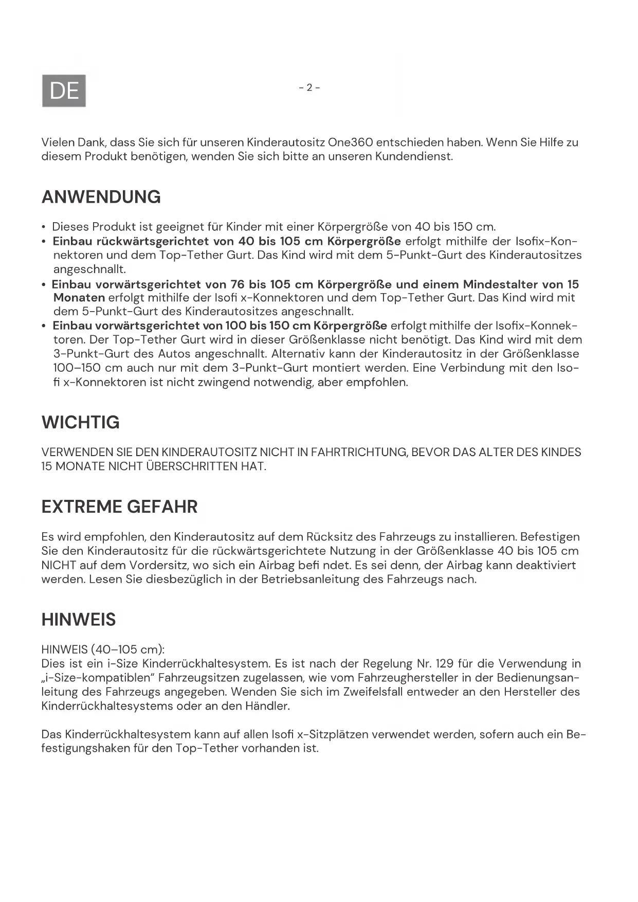 Vielen Dank, dass Sie sich für unseren Kinderautositz One360 entschieden haben. Wenn Sie Hilfe zu diesem Produkt benötigen, wenden Sie sich bitte an unseren Kundendienst. ANWENDUNG