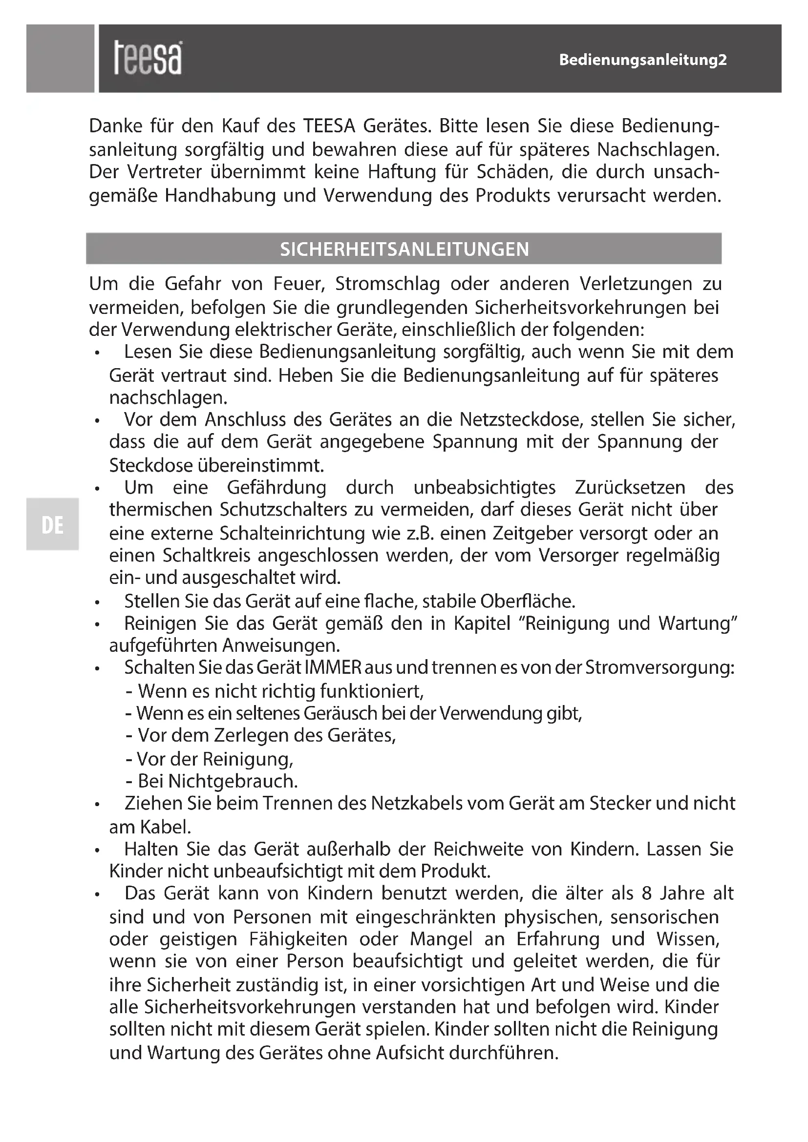 Danke für den Kauf des TEESA Gerätes.itte lessen Sie diese Bedienungsanleitung sorgfältig und bewahren these auf fur spateres Nachschlagen. Der Vertreter übernimmt keine Haftung fur Schaden, die durch unsachgemäß Handhabung und Verwendung des Produkts verursacht werden.