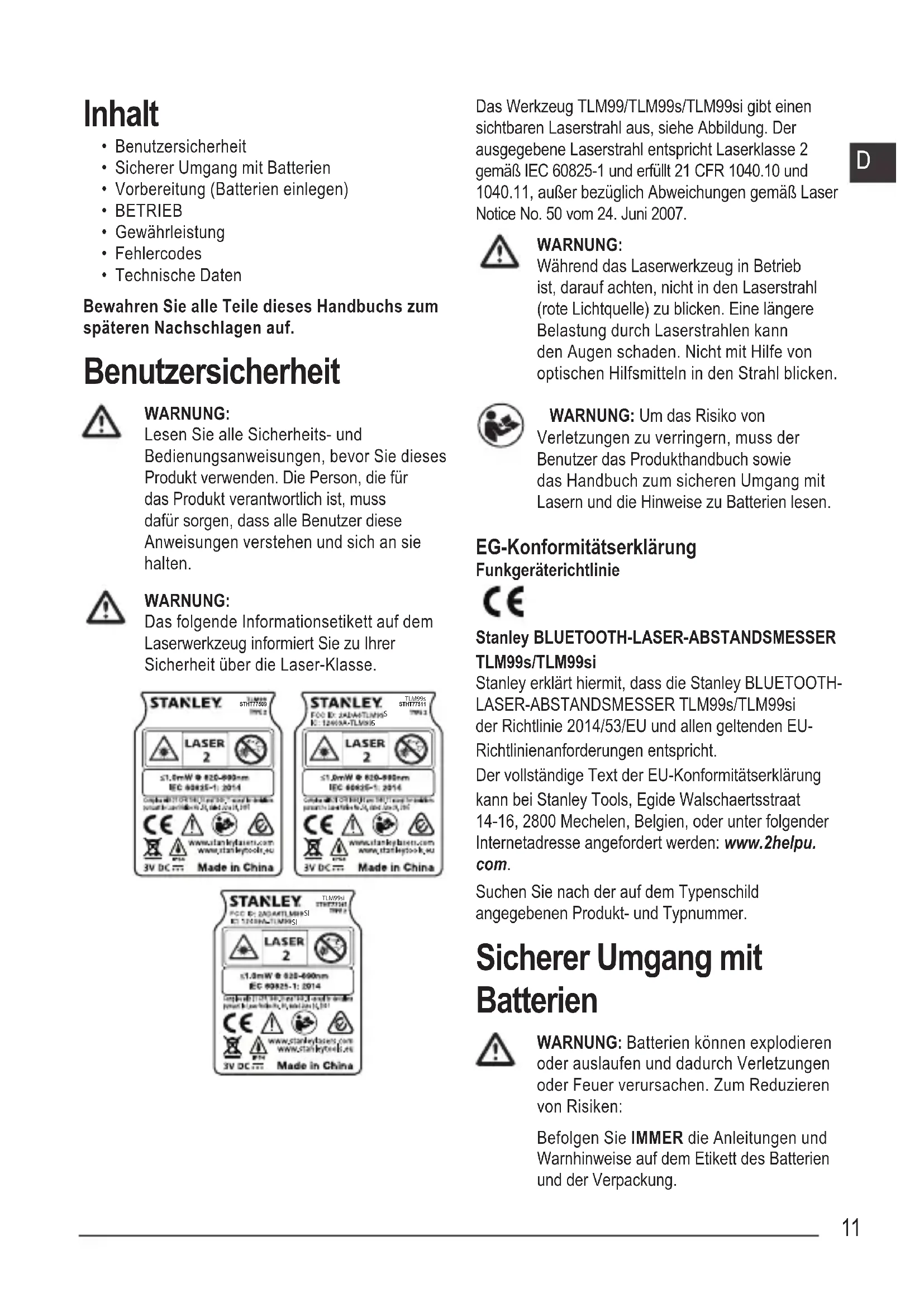 TLM99si Das Werkzeug TLM99/TLM99s/TLM99si gibt einen sichtbaren Laserstrahl aus, siehe Abbildung. Der ausgegebene Laserstrahl entspricht Laserklasse 2 gemäß IEC 60825-1 und erfüllt 21 CFR 1040.10 und 1040.11, außer bezüglich Abweichungen gemäß Laser Notice No. 50 vom 24. Juni 2007.WARNUNG:Während das Laserwerkzeug in Betrieb ist, darauf achten, nicht in den Laserstrahl (rote Lichtquelle) zu blicken. Eine längere Belastung durch Laserstrahlen kann den Augen schaden. Nicht mit Hilfe von optischen Hilfsmitteln in den Strahl blicken. WARNUNG: Um das Risiko von Verletzungen zu verringern, muss der Benutzer das Produkthandbuch sowie das Handbuch zum sicheren Umgang mit Lasern und die Hinweise zu Batterien lesen. EG-Konformitätserklärung FunkgeräterichtlinieStanley BLUETOOTH-LASER-ABSTANDSMESSER TLM99s/TLM99siStanley erklärt hiermit, dass die Stanley BLUETOOTH-LASER-ABSTANDSMESSER TLM99s/TLM99si der Richtlinie 2014/53/EU und allen geltenden EU-Richtlinienanforderungen entspricht.Der vollständige Text der EU-Konformitätserklärung kann bei Stanley Tools, Egide Walschaertsstraat 14-16, 2800 Mechelen, Belgien, oder unter folgender Internetadresse angefordert werden: www.2helpu.com.Suchen Sie nach der auf dem Typenschild angegebenen Produkt- und Typnummer. Sicherer Umgang mit Batterien WARNUNG: Batterien können explodieren oder auslaufen und dadurch Verletzungen oder Feuer verursachen. Zum Reduzieren von Risiken:Befolgen Sie IMMER die Anleitungen und Warnhinweise auf dem Etikett des Batterien und der Verpackung.