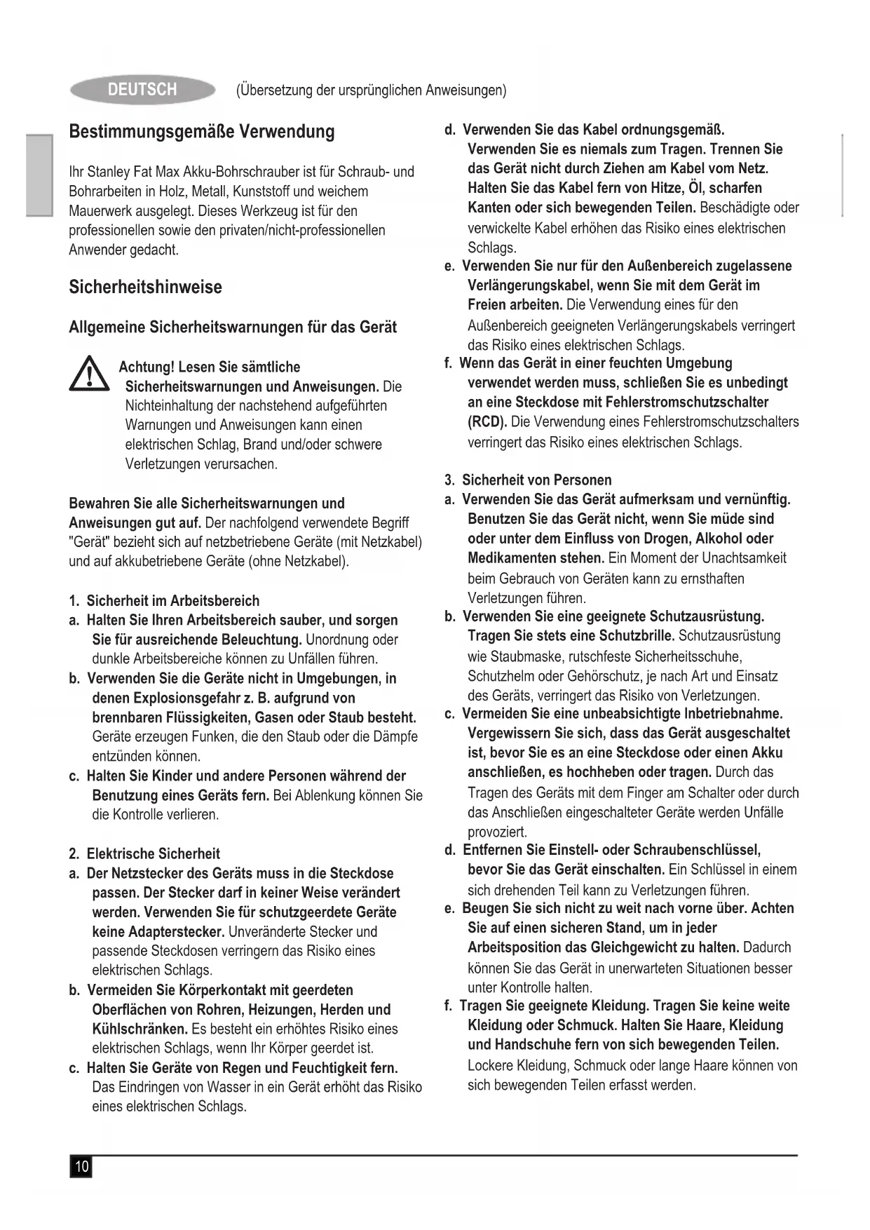 Versuchen Sie nie, beschädigte Akkus aufzuladen. Ladegeräte u Verwenden Sie das Stanley Fat Max Ladegerät nur für den Akku des Werkzeugs, mit dem es geliefert wurde. Andere Akkus könnten platzen und Sachschäden oder Verletzungen verursachen. u Versuchen Sie keinesfalls, nicht auadbare Batterien zu laden. u Lassen Sie beschädigte Kabel sofort austauschen.13 (Übersetzung der ursprünglichen Anweisungen) DEUTSCH u Achten Sie darauf, dass das Ladegerät nicht mit Wasser in Berührung kommt. u Versuchen Sie nicht, das Ladegerät zu öffnen. u Nehmen Sie am Ladegerät keine Veränderungen vor.