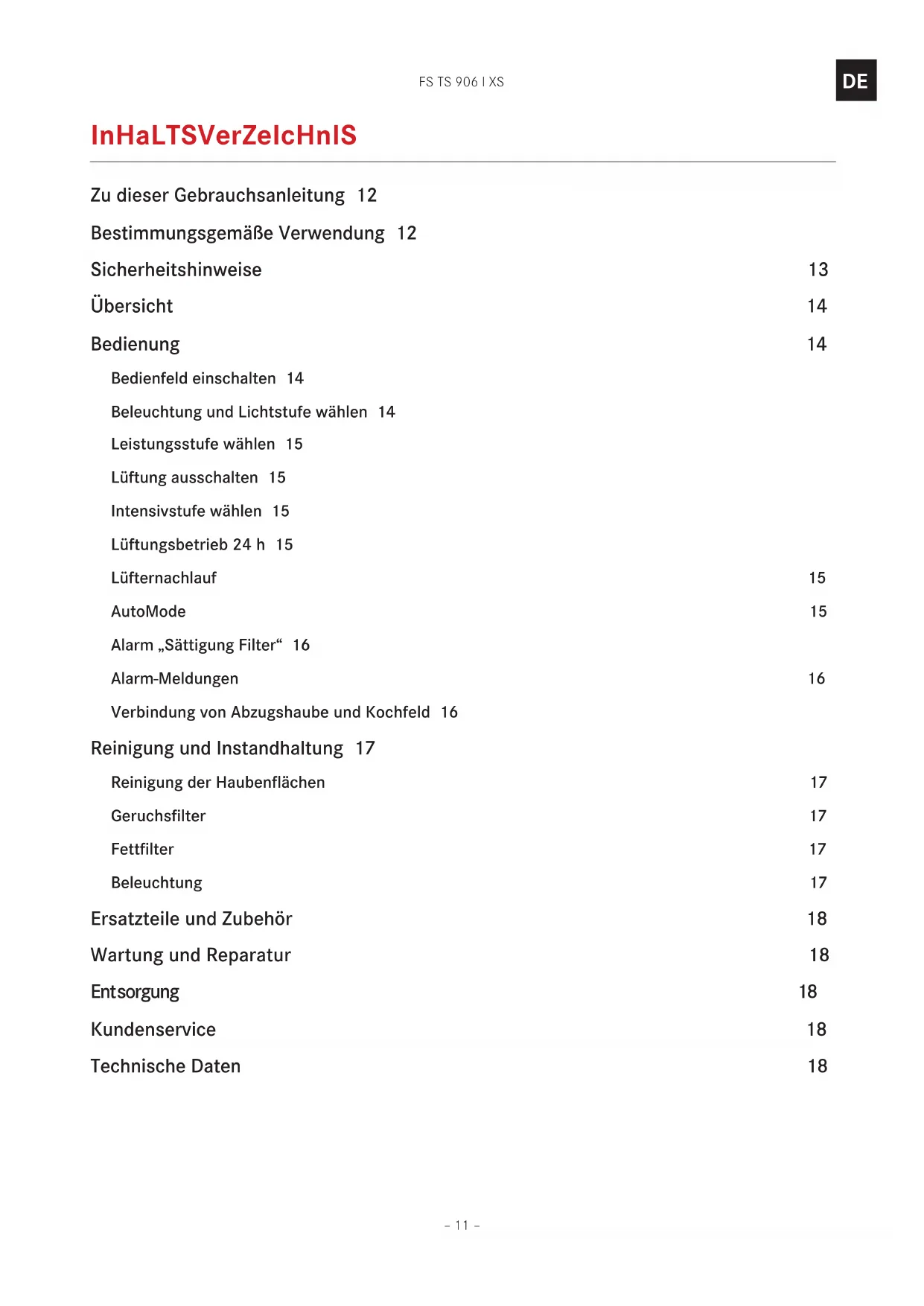 inhalTsverzeichnis Zu dieser Gebrauchsanleitung 12 Bestimmungsgemäße Verwendung 12 Sicherheitshinweise 13 Übersicht 14 Bedienung 14 Bedienfeld einschalten 14 Beleuchtung und Lichtstufe wählen 14 Leistungsstufe wählen 15 Lüftung ausschalten 15 Intensivstufe wählen 15 Lüftungsbetrieb 24h 15 Lüfternachlauf 15 AutoMode 15 Alarm „Sättigung Filter“ 16 Alarm-Meldungen 16 Verbindung von Abzugshaube und Kochfeld 16 Reinigung und Instandhaltung 17 Reinigung der Haubenflächen 17 Geruchsfilter 17 Fettfilter 17 Beleuchtung 17 Ersatzteile und Zubehör 18 Wartung und Reparatur 18 Entsorgung 18 Kundenservice 18 Technische Daten 18FS TS 906 I XS – 12 –