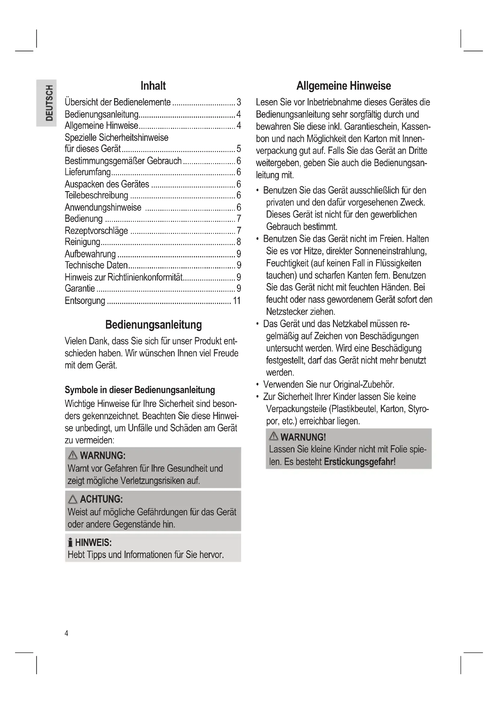 - Entsorgung Bedienungsanleitung Vielen Dank, dass Sie sich für unser Produkt ent- schieden haben. Wir wünschen Ihnen viel Freude mit dem Gerät. Symbole in dieser Bedienungsanleitung Wichtige Hinweise für Ihre Sicherheit sind beson- ders gekennzeichnet. Beachten Sie diese Hinwei- se unbedingt, um Unfälle und Schäden am Gerät zu vermeiden: WARNUNG: Warnt vor Gefahren für Ihre Gesundheit und zeigt mögliche Verletzungsrisiken auf. ACHTUNG: Weist auf mögliche Gefährdungen für das Gerät oder andere Gegenstände hin. HINWEIS: Hebt Tipps und Informationen für Sie hervor. Allgemeine Hinweise Lesen Sie vor Inbetriebnahme dieses Gerätes die Bedienungsanleitung sehr sorgfältig durch und bewahren Sie diese inkl. Garantieschein, Kassen- bon und nach Möglichkeit den Karton mit Innen- verpackung gut auf. Falls Sie das Gerät an Dritte weitergeben, geben Sie auch die Bedienungsan- leitung mit. p. 11