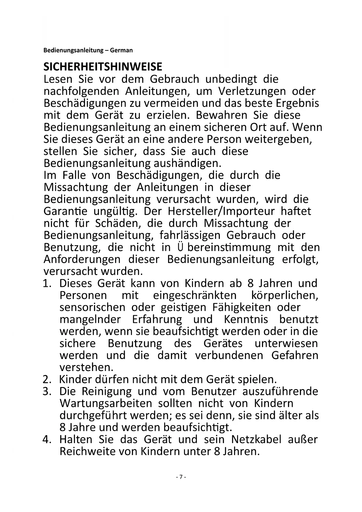 Reichweite von Kindern unter 8 Jahren.- 8 -