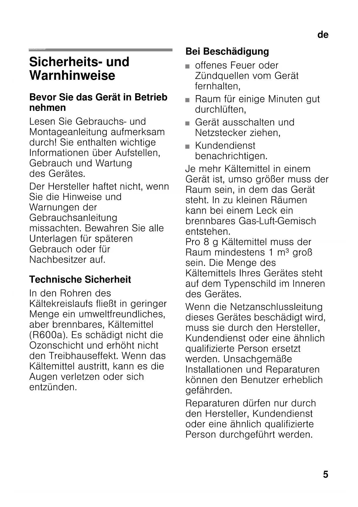 deInhaltsverzeichnis deGebrauchsanleitung Sicherheits- und Warnhinweise Bevor Sie das Gerät in Betrieb nehmen Lesen Sie Gebrauchs- und Montageanleitung aufmerksam durch! Sie enthalten wichtige Informationen über Aufstellen, Gebrauch und Wartung des Gerätes. Der Hersteller haftet nicht, wenn Sie die Hinweise und Warnungen der Gebrauchsanleitung missachten. Bewahren Sie alle Unterlagen für späteren Gebrauch oder für Nachbesitzer auf. Technische Sicherheit In den Rohren des Kältekreislaufs fließt in geringer Menge ein umweltfreundliches, aber brennbares, Kältemittel (R600a). Es schädigt nicht die Ozonschicht und erhöht nicht den Treibhauseffekt. Wenn das Kältemittel austritt, kann es die Augen verletzen oder sich entzünden. Bei Beschädigung ■ offenes Feuer oder Zündquellen vom Gerät fernhalten, ■ Raum für einige Minuten gut durchlüften, ■ Gerät ausschalten und Netzstecker ziehen, ■ Kundendienst benachrichtigen. Je mehr Kältemittel in einem Gerät ist, umso größer muss der Raum sein, in dem das Gerät steht. In zu kleinen Räumen kann bei einem Leck ein brennbares Gas-Luft-Gemisch entstehen. Pro 8 g Kältemittel muss der Raum mindestens 1 m³ groß sein. Die Menge des Kältemittels Ihres Gerätes steht auf dem Typenschild im Inneren des Gerätes. Wenn die Netzanschlussleitung dieses Gerätes beschädigt wird, muss sie durch den Hersteller, Kundendienst oder eine ähnlich qualifizierte Person ersetzt werden. Unsachgemäße Installationen und Reparaturen können den Benutzer erheblich gefährden. Reparaturen dürfen nur durch den Hersteller, Kundendienst oder eine ähnlich qualifizierte Person durchgeführt werden.de