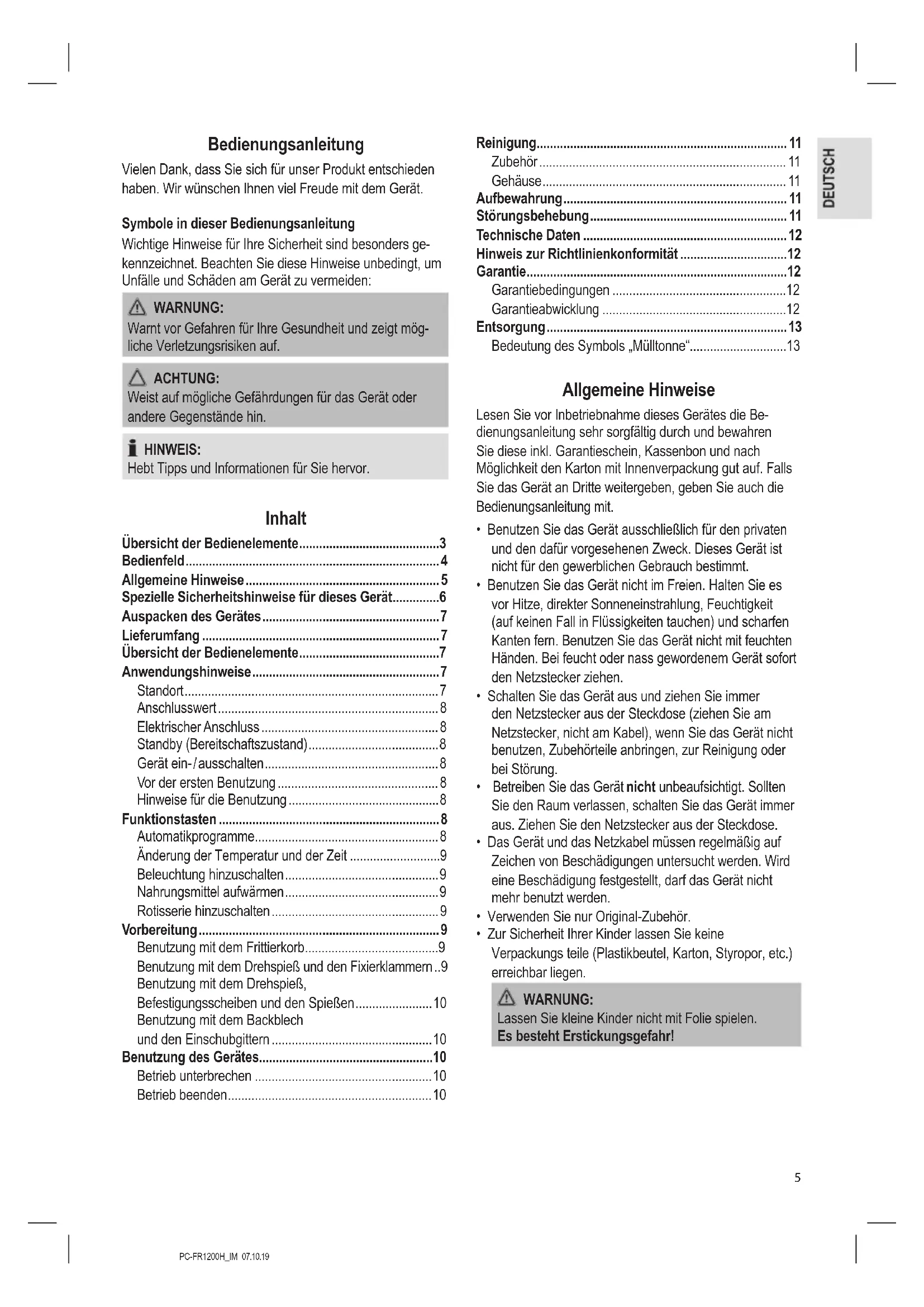 - Zur Sicherheit Ihrer Kinder lassen Sie keine Verpackungs teile (Plastikbeutel, Karton, Styropor, etc.) erreichbar liegen. WARNUNG: Lassen Sie kleine Kinder nicht mit Folie spielen. Es besteht Erstickungsgefahr!6 PC-FR1200H_IM 07.10.19 Spezielle Sicherheitshinweise für dieses Gerät Auf dem Produkt nden Sie folgendes Symbol mit Warncharakter: WARNUNG: Heiße Oberäche! Verbrennungsgefahr! Während des Betriebes und danach wird die Temperatur der be- rührbaren Oberächen sehr hoch sein.