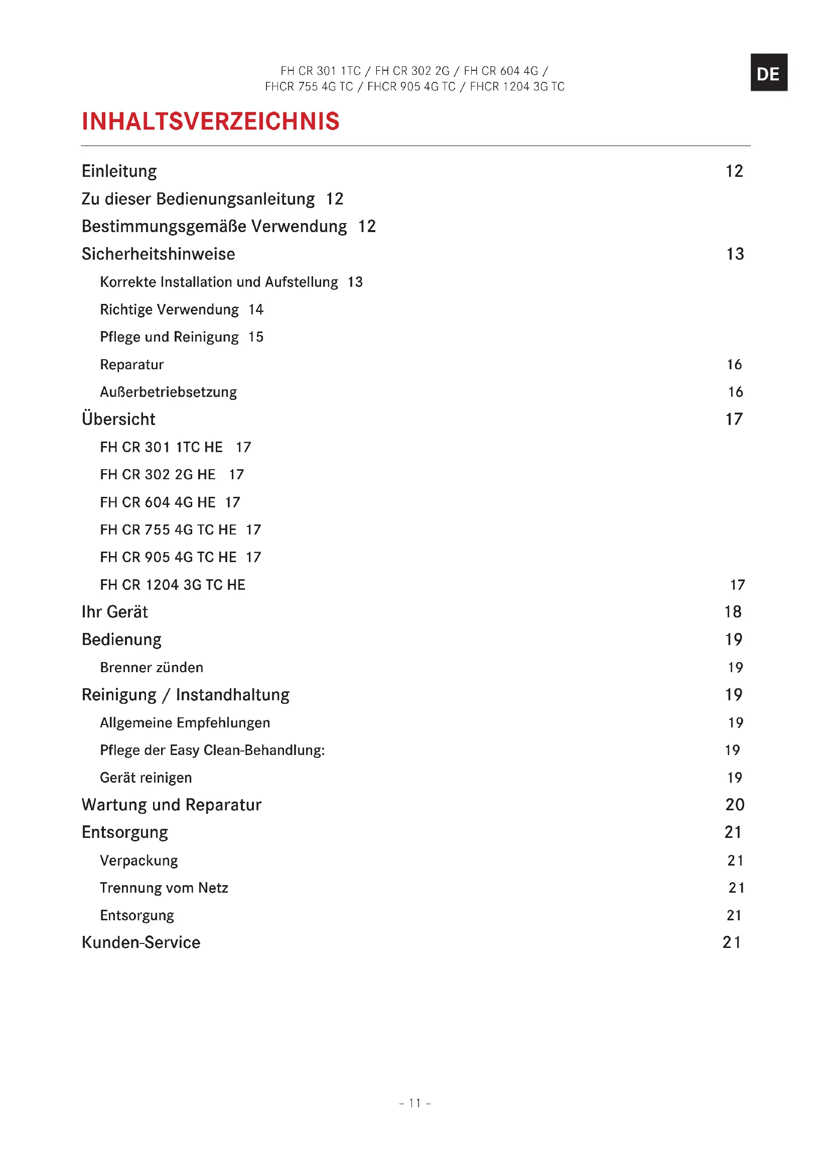 INHALTSVERZEICHNIS Einleitung 12 Zu dieser Bedienungsanleitung 12 Bestimmungsgemäße Verwendung 12 Sicherheitshinweise 13 Korrekte Installation und Aufstellung 13 Richtige Verwendung 14 Pflege und Reinigung 15 Reparatur 16 Außerbetriebsetzung 16 Übersicht 17 FH CR 301 1TC HE 17 FH CR 302 2G HE 17 FH CR 604 4G HE 17 FH CR 755 4G TC HE 17 FH CR 905 4G TC HE 17 FH CR 1204 3G TC HE 17 Ihr Gerät 18 Bedienung 19 Brenner zünden 19 Reinigung / Instandhaltung 19 Allgemeine Empfehlungen 19 Pflege der Easy Clean-Behandlung: 19 Gerät reinigen 19 Wartung und Reparatur 20 Entsorgung 21 Verpackung 21 Trennung vom Netz 21 Entsorgung 21 Kunden-Service 21– 12 – FH CR 301 1TC / FH CR 302 2G / FH CR 604 4G / FHCR 755 4G TC / FHCR 905 4G TC / FHCR 1204 3G TC