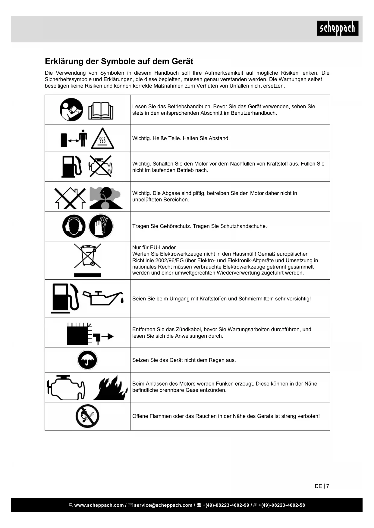 Erklärung der Symbole auf dem Gerät Die Verwendung von Symbolen in diesem Handbuch soll Ihre Aufmerksamkeit auf mögliche Risiken lenken. Die Sicherheitssymbole und Erklärungen, die diese begleiten, müssen genau verstanden werden. Die Warnungen selbst beseitigen keine Risiken und können korrekte Maßnahmen zum Verhüten von Unfällen nicht ersetzen. Lesen Sie das Betriebshandbuch. Bevor Sie das Gerät verwenden, sehen Sie stets in den entsprechenden Abschnitt im Benutzerhandbuch. Wichtig. Heiße Teile. Halten Sie Abstand. Wichtig. Schalten Sie den Motor vor dem Nachfüllen von Kraftsto aus. Füllen Sie nicht im laufenden Betrieb nach. Wichtig. Die Abgase sind giftig, betreiben Sie den Motor daher nicht in unbelüfteten Bereichen. Tragen Sie Gehörschutz. Tragen Sie Schutzhandschuhe. Nur für EU-Länder Werfen Sie Elektrowerkzeuge nicht in den Hausmüll! Gemäß europäischer Richtlinie 2002/96/EG über Elektro- und Elektronik-Altgeräte und Umsetzung in nationales Recht müssen verbrauchte Elektrowerkzeuge getrennt gesammelt werden und einer umweltgerechten Wiederverwertung zugeführt werden. Seien Sie beim Umgang mit Kraftstoen und Schmiermitteln sehr vorsichtig! Entfernen Sie das Zündkabel, bevor Sie Wartungsarbeiten durchführen, und lesen Sie sich die Anweisungen durch. Setzen Sie das Gerät nicht dem Regen aus. Beim Anlassen des Motors werden Funken erzeugt. Diese können in der Nähe bendliche brennbare Gase entzünden. Oene Flammen oder das Rauchen in der Nähe des Geräts ist streng verboten! www.scheppach.com / service@scheppach.com / +(49)-08223-4002-99 / +(49)-08223-4002-58