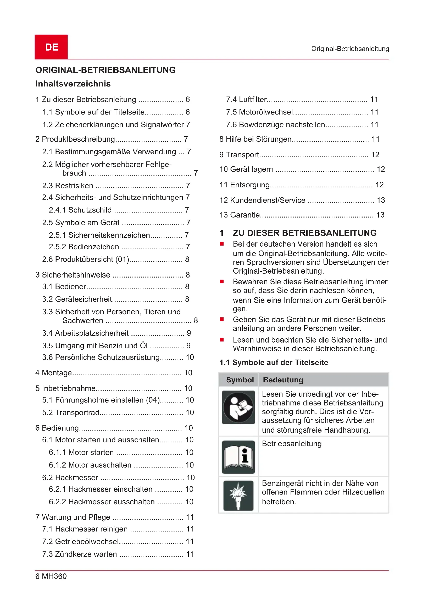 = 90,78 dB(A)DE 6 MH360 Original-Betriebsanleitung ORIGINAL-BETRIEBSANLEITUNG Inhaltsverzeichnis 1 Zu dieser Betriebsanleitung ..................... 6