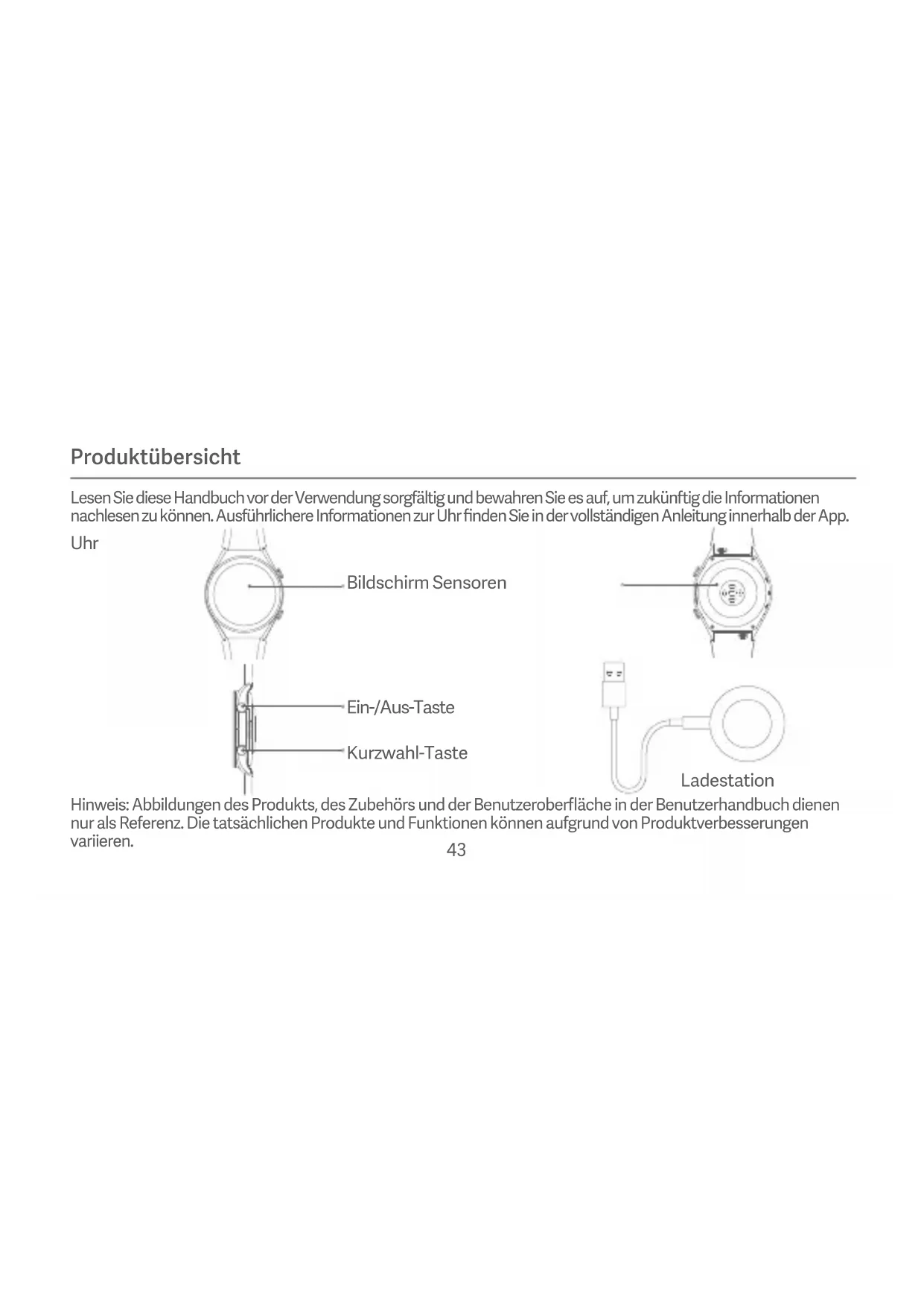 Bewahren Sie das Netzteil, die Ladestation und die Uhr während des Ladevorgangs in einer trockenen Umgebung auf. Berühren Sie das Netzteil und die Ladestation nicht mit nassen Händen. Setzen Sie das Netzteil, die Ladestation und die Uhr nicht Regen oder anderen Flüssigkeiten aus. Die Betriebstemperatur der Uhr liegt zwischen 0°C und 45°C. Wenn die Umgebungstemperatur zu hoch oder zu niedrig ist, kann dies zu Fehlfunktionen der Uhr führen. Die Uhr verfügt über einen eingebaute Akku. Um Schäden am Akku oder der Uhr zu vermeiden, sollten Sie die Uhr nicht selbst zerlegen und den Akku ersetzen. Der Akku darf nur von autorisierten Serviceanbietern ausgewechselt werden. Andernfalls kann es bei Verwendung eines falschen Akkutyps zu Gefahren bis #hin zu Personenschäden kommen. Der Akku darf nicht zerlegt, geschlagen, zerquetscht oder ins Feuer geworfen werden. Wenn der Akku aufschwillt oder Flüssigkeit austri, muss der Gebrauch sofort eingestellt werden. Werfen Sie die Uhr oder den Akku niemals ins Feuer, da dies zu Explosionen führen kann. Diese Uhr ist kein medizinisches Gerät und die von der Uhr bereitgestellten Daten und Informationen sollten nicht als Grundlage für Diagnosen, Behandlungen oder zur gesundheitlichen Prävention verwendet werden. Die Uhr und das Zubehör können Kleinteile enthalten. Um zu vermeiden, dass Kinder einer Erstickungsgefahr ausgesetzt oder dass anderweitige Gefahren oder Schäden verursacht werden, sollten Sie die Uhr außerhalb der Reichweite von Kindern auewahren. Die Uhr ist kein Spielzeug. Bewahren Sie sie außerhalb der Reichweite von Kindern auf.