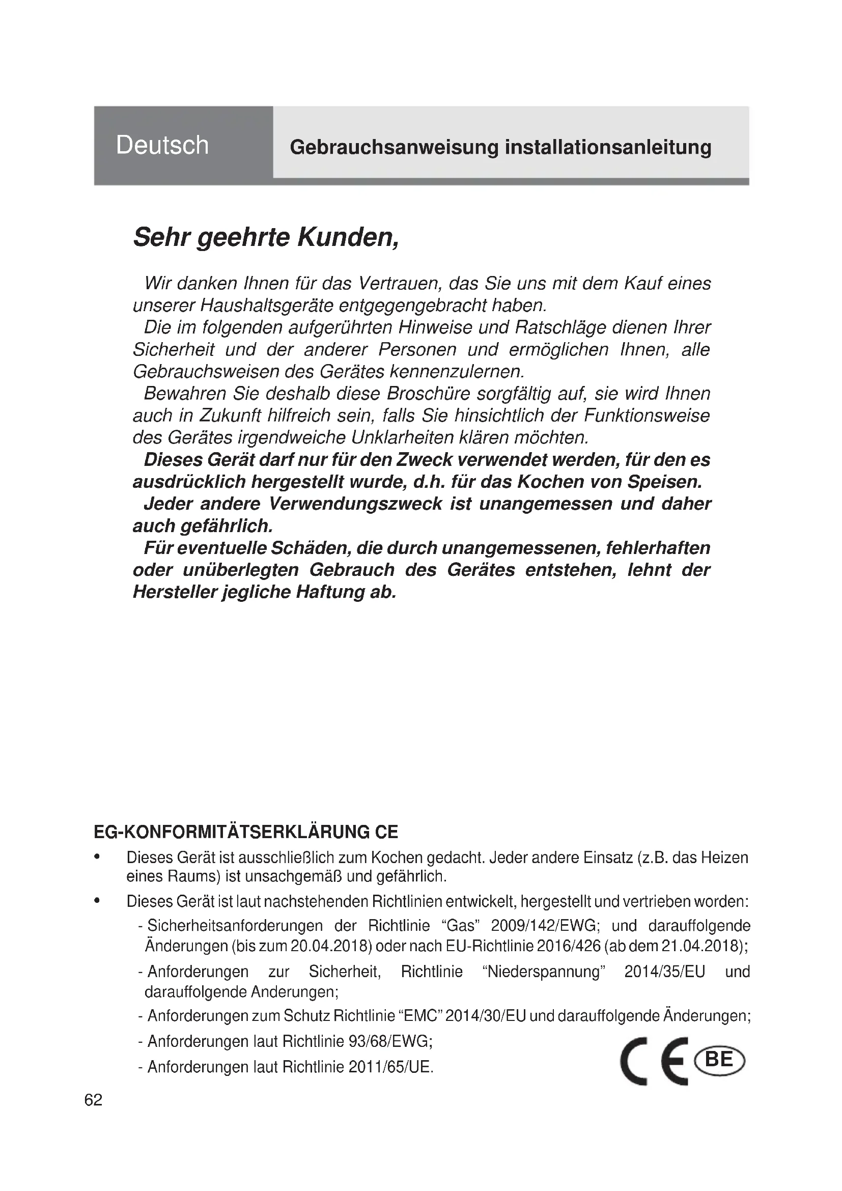 Afb. 9.16162 Sehr geehrte Kunden, Wir danken Ihnen für das Vertrauen, das Sie uns mit dem Kauf eines unserer Haushaltsgeräte entgegengebracht haben.Die im folgenden aufgerührten Hinweise und Ratschläge dienen Ihrer Sicherheit und der anderer Personen und ermöglichen Ihnen, alle Gebrauchsweisen des Gerätes kennenzulernen.Bewahren Sie deshalb diese Broschüre sorgfältig auf, sie wird Ihnen auch in Zukunft hilfreich sein, falls Sie hinsichtlich der Funktionsweise des Gerätes irgendweiche Unklarheiten klären möchten.Dieses Gerät darf nur für den Zweck verwendet werden, für den es ausdrücklich hergestellt wurde, d.h. für das Kochen von Speisen.Jeder andere Verwendungszweck ist unangemessen und daher auch gefährlich.Für eventuelle Schäden, die durch unangemessenen, fehlerhaften oder unüberlegten Gebrauch des Gerätes entstehen, lehnt der Hersteller jegliche Haftung ab. Deutsch Gebrauchsanweisung installationsanleitung