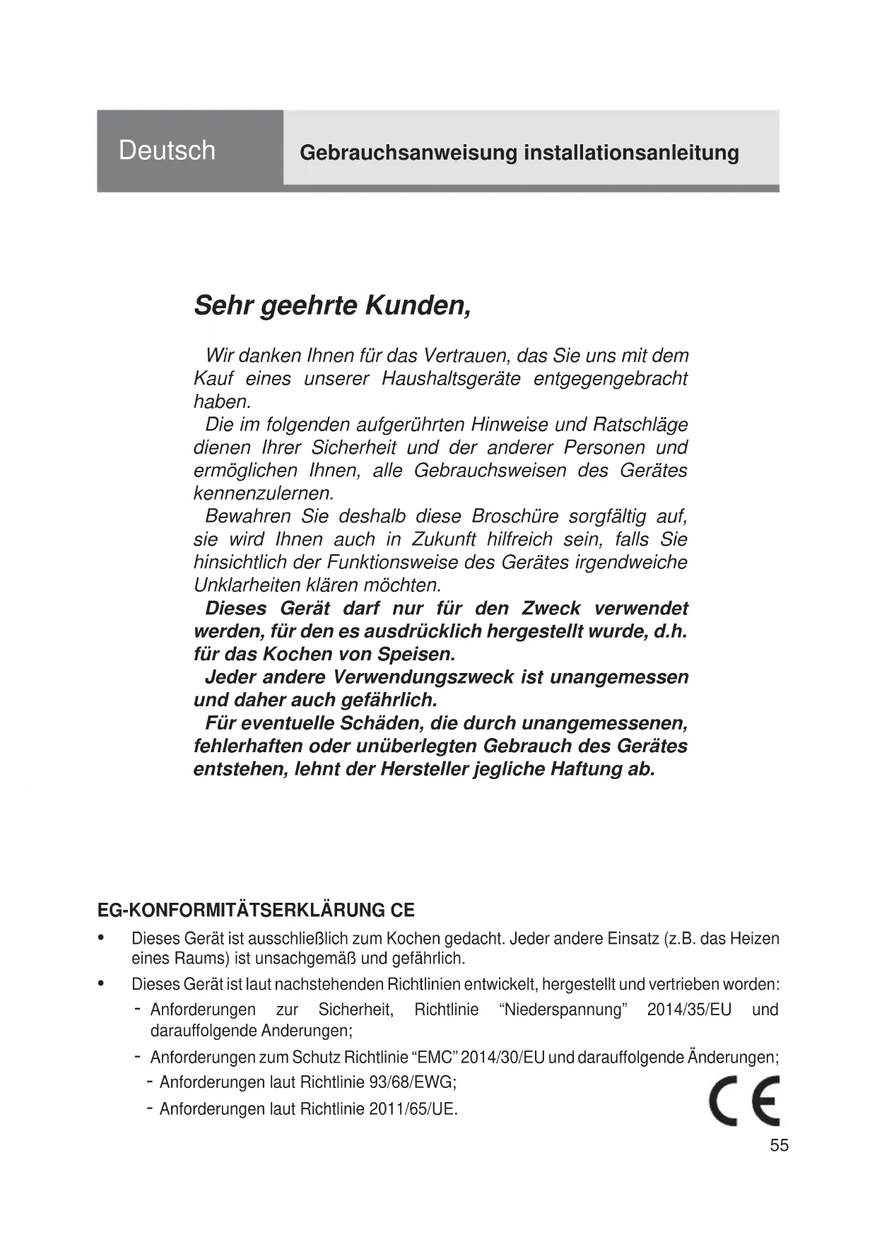 ac5455 Sehr geehrte Kunden, Wir danken Ihnen für das Vertrauen, das Sie uns mit dem Kauf eines unserer Haushaltsgeräte entgegengebracht haben.Die im folgenden aufgerührten Hinweise und Ratschläge dienen Ihrer Sicherheit und der anderer Personen und ermöglichen Ihnen, alle Gebrauchsweisen des Gerätes kennenzulernen.Bewahren Sie deshalb diese Broschüre sorgfältig auf, sie wird Ihnen auch in Zukunft hilfreich sein, falls Sie hinsichtlich der Funktionsweise des Gerätes irgendweiche Unklarheiten klären möchten.Dieses Gerät darf nur für den Zweck verwendet werden, für den es ausdrücklich hergestellt wurde, d.h. für das Kochen von Speisen.Jeder andere Verwendungszweck ist unangemessen und daher auch gefährlich.Für eventuelle Schäden, die durch unangemessenen, fehlerhaften oder unüberlegten Gebrauch des Gerätes entstehen, lehnt der Hersteller jegliche Haftung ab. Deutsch Gebrauchsanweisung installationsanleitung
