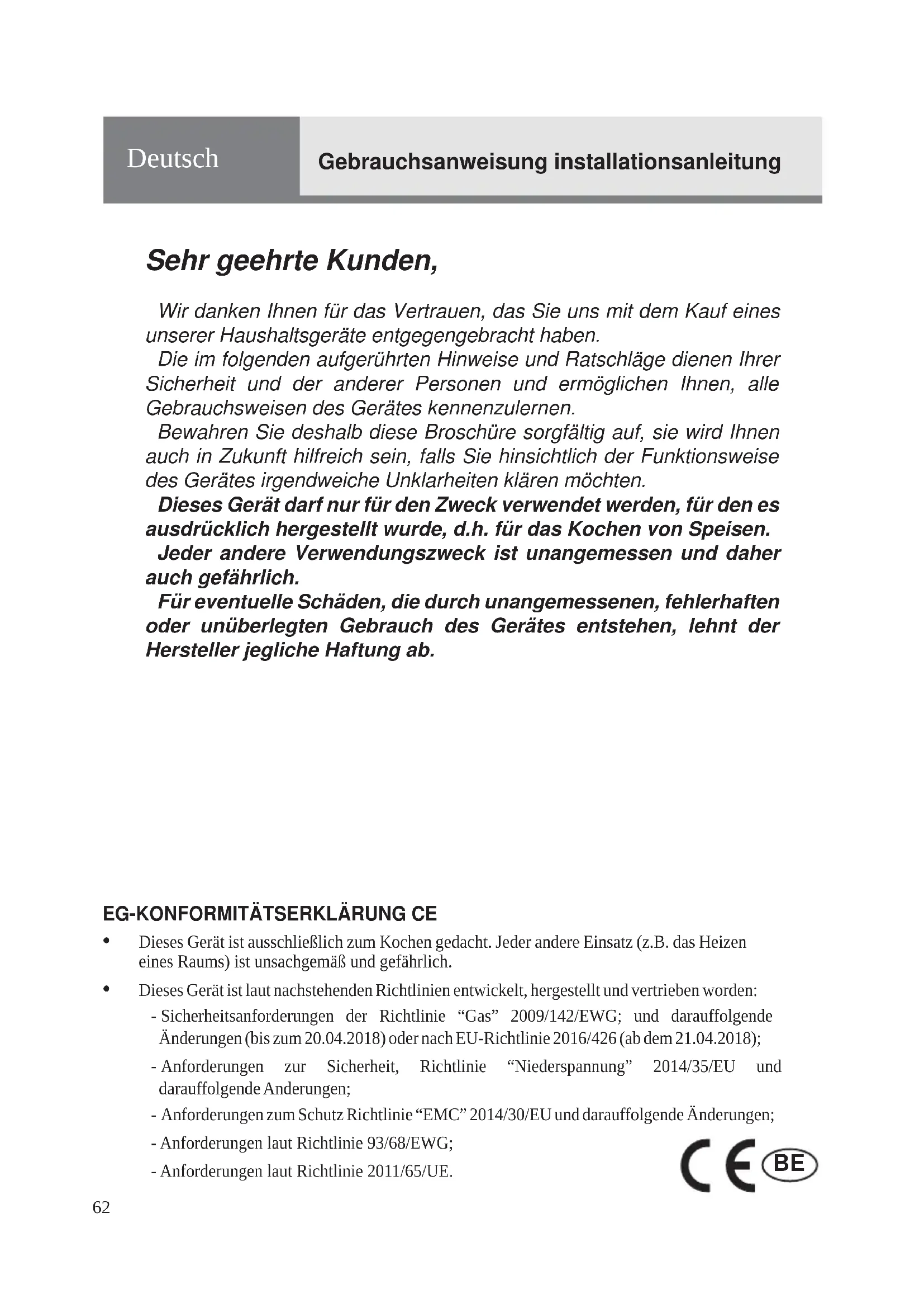 Afb. 9.16162 Sehr geehrte Kunden, Wir danken Ihnen für das Vertrauen, das Sie uns mit dem Kauf eines unserer Haushaltsgeräte entgegengebracht haben.Die im folgenden aufgerührten Hinweise und Ratschläge dienen Ihrer Sicherheit und der anderer Personen und ermöglichen Ihnen, alle Gebrauchsweisen des Gerätes kennenzulernen.Bewahren Sie deshalb diese Broschüre sorgfältig auf, sie wird Ihnen auch in Zukunft hilfreich sein, falls Sie hinsichtlich der Funktionsweise des Gerätes irgendweiche Unklarheiten klären möchten.Dieses Gerät darf nur für den Zweck verwendet werden, für den es ausdrücklich hergestellt wurde, d.h. für das Kochen von Speisen.Jeder andere Verwendungszweck ist unangemessen und daher auch gefährlich.Für eventuelle Schäden, die durch unangemessenen, fehlerhaften oder unüberlegten Gebrauch des Gerätes entstehen, lehnt der Hersteller jegliche Haftung ab. Deutsch Gebrauchsanweisung installationsanleitung