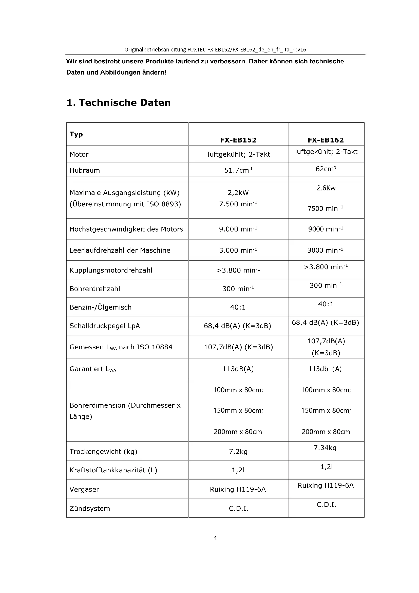 Ihr neues Gerät wurde entwickelt und konstruiert, so dass es FUXTEC hohen Ansprüchen genügt, wie die einfache Bedienung und Benutzersicherheit. Ordentlich behandelt wird Ihnen dieses Gerät auf Jahre hinaus gute Dienste erweisen. WARNUNG: Um das Risiko von Verletzungen zu verringern, muss der Benutzer diese Anleitung lesen und verstehen, bevor das Gerät in Betrieb genommen wird. FUXTEC GMBH KAPPSTRAßE 69, 71083 HERRENBERG, GERMANYOriginalbetriebsanleitung FUXTEC FX-EB152/FX-EB162_de_en_fr_ita_rev16