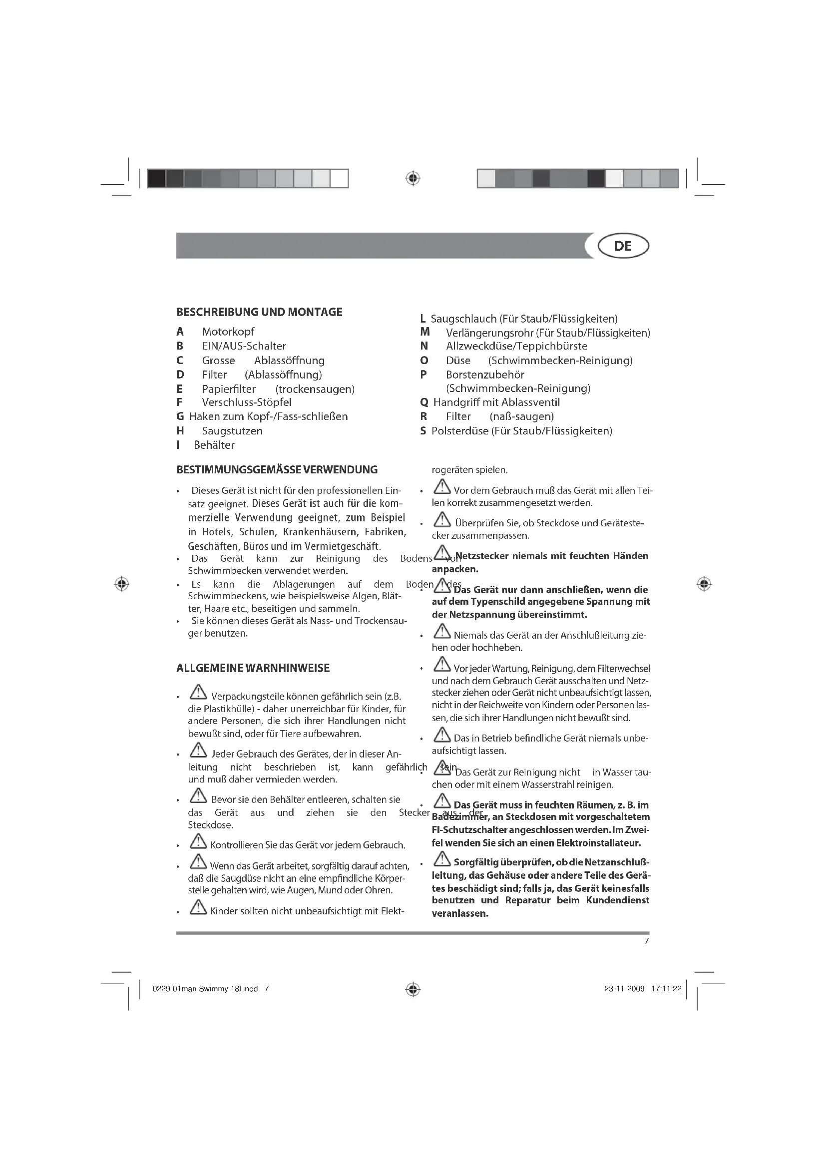 7FSMÊOHFSVOHTSPIS'àS4UBVC'MàTTJHLFJUFO N Allzweckdüse/Teppichbürste O Düse (Schwimmbecken-Reinigung) P Borstenzubehör (Schwimmbecken-Reinigung) Q Handgriff mit Ablassventil R Filter (naß-saugen) S Polsterdüse (Für Staub/Flüssigkeiten) 0229-01man Swimmy 18l.indd 7 23-11-2009 17:11:228 Verschluss-Stopfen (F)BOEFN#FIÊMUFS(I).